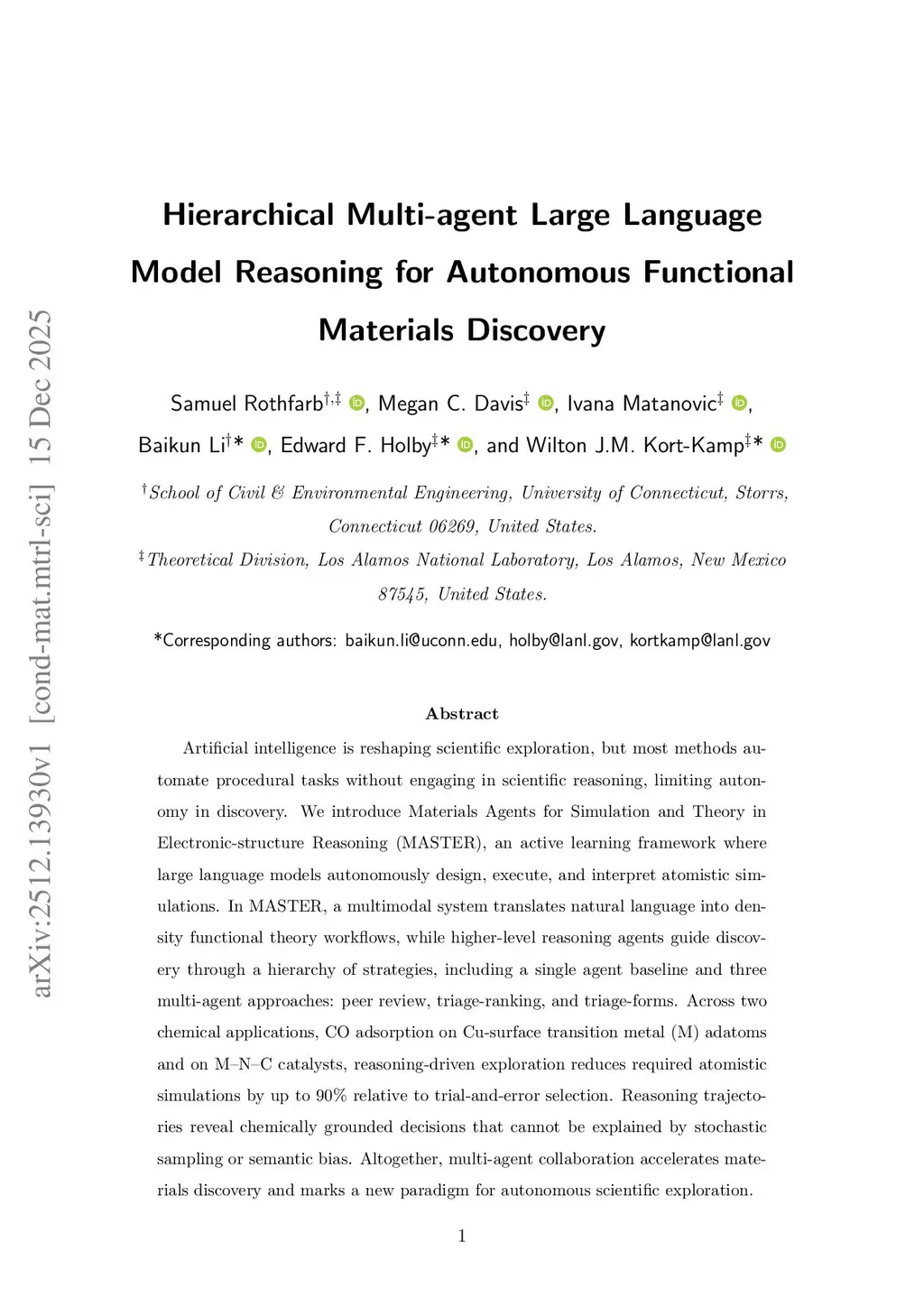 Artificial intelligence is reshaping scientific exploration, but most methods automate procedural tasks without engaging in scientific reasoning, limiting autonomy in discovery. We introduce Materials Agents for Simulation and Theory in Electronic-structure Reasoning (MASTER), an active learning framework where large language models autonomously design, execute, and interpret atomistic simulations. In MASTER, a multimodal system translates natural language into density functional theory workflows, while higher-level reasoning agents guide discovery through a hierarchy of strategies, including a single agent baseline and three multi-agent approaches: peer review, triage-ranking, and triage-forms. Across two chemical applications, CO adsorption on Cu-surface transition metal (M) adatoms and on M-N-C catalysts, reasoning-driven exploration reduces required atomistic simulations by up to 90% relative to trial-and-error selection. Reasoning trajectories reveal chemically grounded decisions that cannot be explained by stochastic sampling or semantic bias. Altogether, multi-agent collaboration accelerates materials discovery and marks a new paradigm for autonomous scientific exploration.