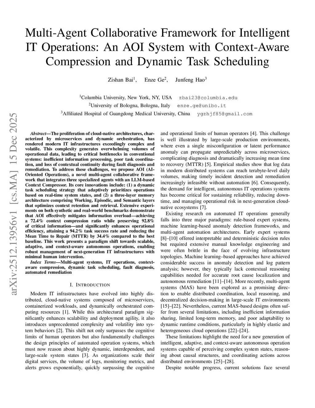 The proliferation of cloud-native architectures, characterized by microservices and dynamic orchestration, has rendered modern IT infrastructures exceedingly complex and volatile. This complexity generates overwhelming volumes of operational data, leading to critical bottlenecks in conventional systems: inefficient information processing, poor task coordination, and loss of contextual continuity during fault diagnosis and remediation. To address these challenges, we propose AOI (AI-Oriented Operations), a novel multi-agent collaborative framework that integrates three specialized agents with an LLM-based Context Compressor. Its core innovations include: (1) a dynamic task scheduling strategy that adaptively prioritizes operations based on real-time system states, (2) a three-layer memory architecture comprising Working, Episodic, and Semantic layers that optimizes context retention and retrieval. Extensive experiments on synthetic and real-world benchmarks show that AOI achieves 72.4\% context compression while preserving 92.8\% critical information, improves task success to 94.2\%, and reduces MTTR by 34.4\% over the best baseline. This work presents a paradigm shift towards scalable, adaptive, and context-aware autonomous operations, enabling robust management of next-generation IT infrastructures with minimal human intervention.