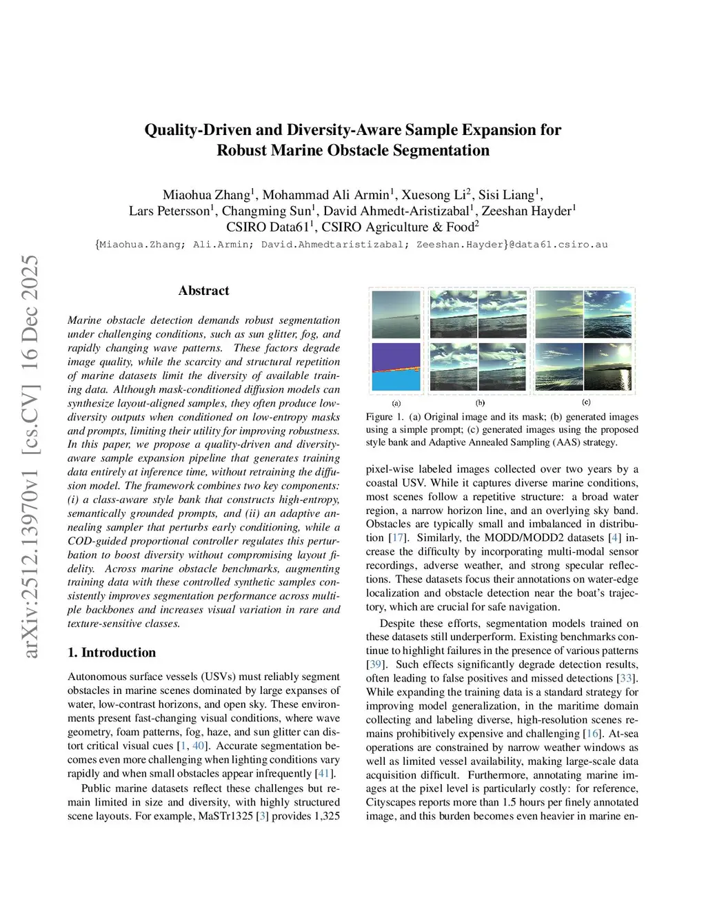 Marine obstacle detection demands robust segmentation under challenging conditions, such as sun glitter, fog, and rapidly changing wave patterns. These factors degrade image quality, while the scarcity and structural repetition of marine datasets limit the diversity of available training data. Although mask-conditioned diffusion models can synthesize layout-aligned samples, they often produce low-diversity outputs when conditioned on low-entropy masks and prompts, limiting their utility for improving robustness. In this paper, we propose a quality-driven and diversity-aware sample expansion pipeline that generates training data entirely at inference time, without retraining the diffusion model. The framework combines two key components:(i) a class-aware style bank that constructs high-entropy, semantically grounded prompts, and (ii) an adaptive annealing sampler that perturbs early conditioning, while a COD-guided proportional controller regulates this perturbation to boost diversity without compromising layout fidelity. Across marine obstacle benchmarks, augmenting training data with these controlled synthetic samples consistently improves segmentation performance across multiple backbones and increases visual variation in rare and texture-sensitive classes.
