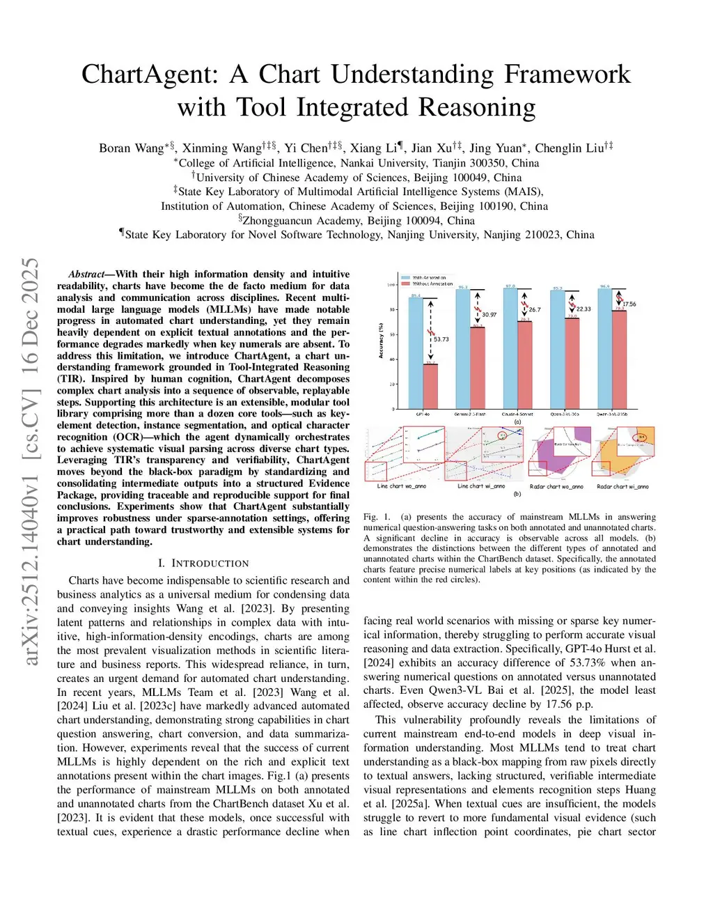 With their high information density and intuitive readability, charts have become the de facto medium for data analysis and communication across disciplines. Recent multimodal large language models (MLLMs) have made notable progress in automated chart understanding, yet they remain heavily dependent on explicit textual annotations and the performance degrades markedly when key numerals are absent. To address this limitation, we introduce ChartAgent, a chart understanding framework grounded in Tool-Integrated Reasoning (TIR). Inspired by human cognition, ChartAgent decomposes complex chart analysis into a sequence of observable, replayable steps. Supporting this architecture is an extensible, modular tool library comprising more than a dozen core tools, such as keyelement detection, instance segmentation, and optical character recognition (OCR), which the agent dynamically orchestrates to achieve systematic visual parsing across diverse chart types. Leveraging TIRs transparency and verifiability, ChartAgent moves beyond the black box paradigm by standardizing and consolidating intermediate outputs into a structured Evidence Package, providing traceable and reproducible support for final conclusions. Experiments show that ChartAgent substantially improves robustness under sparse annotation settings, offering a practical path toward trustworthy and extensible systems for chart understanding.