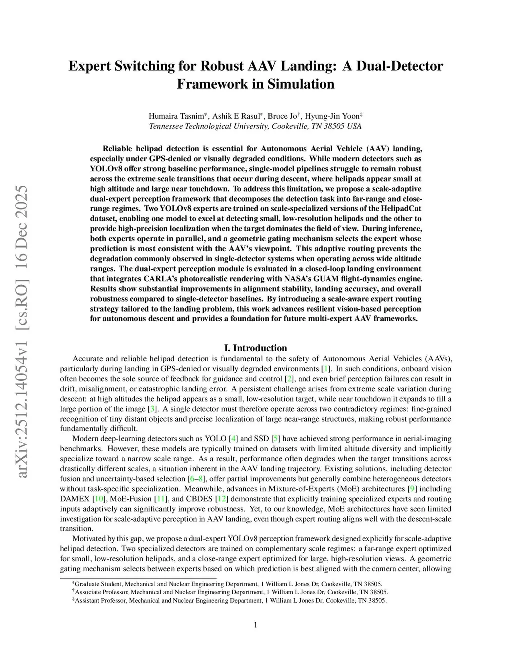 Reliable helipad detection is essential for Autonomous Aerial Vehicle (AAV) landing, especially under GPS-denied or visually degraded conditions. While modern detectors such as YOLOv8 offer strong baseline performance, single-model pipelines struggle to remain robust across the extreme scale transitions that occur during descent, where helipads appear small at high altitude and large near touchdown. To address this limitation, we propose a scale-adaptive dual-expert perception framework that decomposes the detection task into far-range and close-range regimes. Two YOLOv8 experts are trained on scale-specialized versions of the HelipadCat dataset, enabling one model to excel at detecting small, low-resolution helipads and the other to provide high-precision localization when the target dominates the field of view. During inference, both experts operate in parallel, and a geometric gating mechanism selects the expert whose prediction is most consistent with the AAV's viewpoint. This adaptive routing prevents the degradation commonly observed in single-detector systems when operating across wide altitude ranges. The dual-expert perception module is evaluated in a closed-loop landing environment that integrates CARLA's photorealistic rendering with NASA's GUAM flight-dynamics engine. Results show substantial improvements in alignment stability, landing accuracy, and overall robustness compared to single-detector baselines. By introducing a scale-aware expert routing strategy tailored to the landing problem, this work advances resilient vision-based perception for autonomous descent and provides a foundation for future multi-expert AAV frameworks.