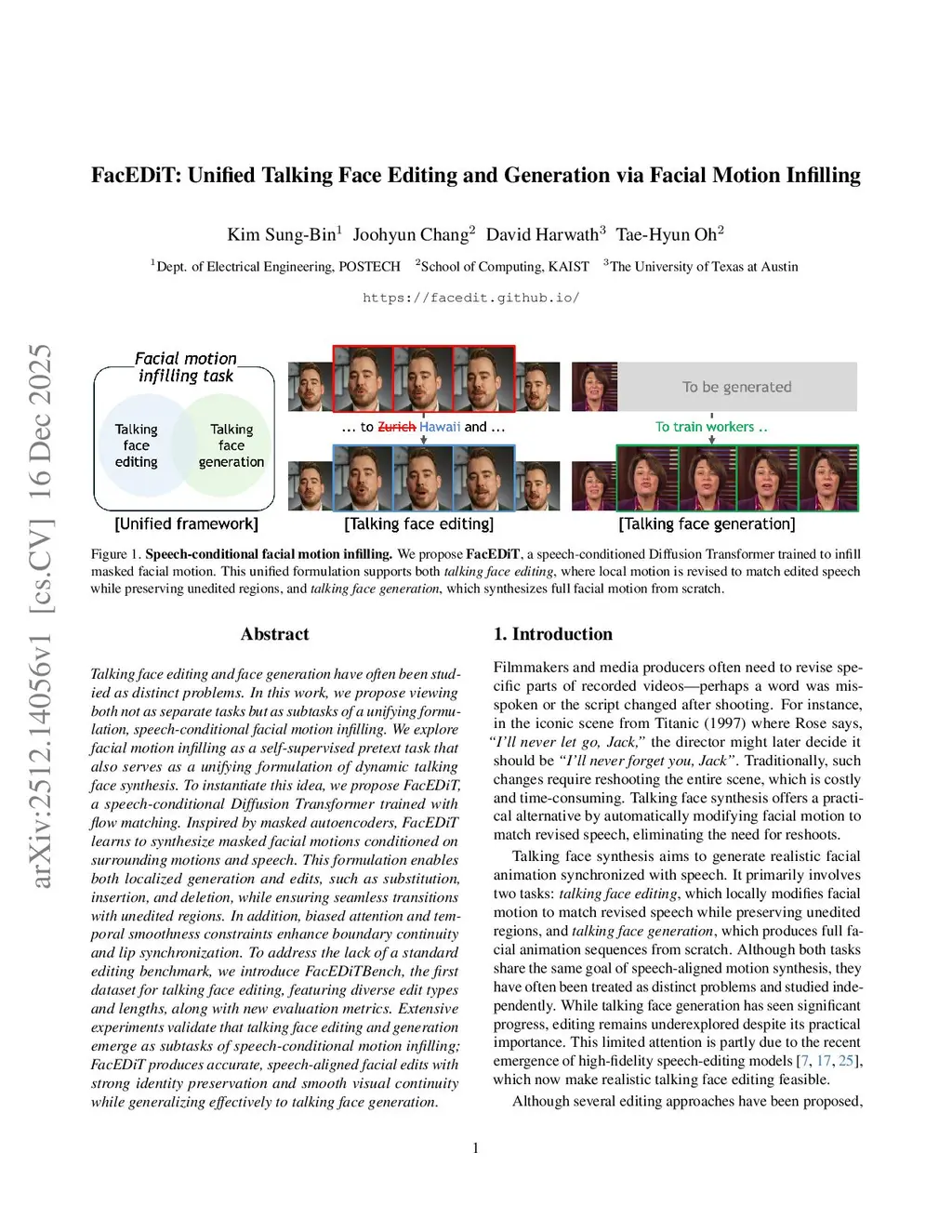 Talking face editing and face generation have often been studied as distinct problems. In this work, we propose viewing both not as separate tasks but as subtasks of a unifying formulation, speech-conditional facial motion infilling. We explore facial motion infilling as a self-supervised pretext task that also serves as a unifying formulation of dynamic talking face synthesis. To instantiate this idea, we propose FacEDiT, a speech-conditional Diffusion Transformer trained with flow matching. Inspired by masked autoencoders, FacEDiT learns to synthesize masked facial motions conditioned on surrounding motions and speech. This formulation enables both localized generation and edits, such as substitution, insertion, and deletion, while ensuring seamless transitions with unedited regions. In addition, biased attention and temporal smoothness constraints enhance boundary continuity and lip synchronization. To address the lack of a standard editing benchmark, we introduce FacEDiTBench, the first dataset for talking face editing, featuring diverse edit types and lengths, along with new evaluation metrics. Extensive experiments validate that talking face editing and generation emerge as subtasks of speech-conditional motion infilling; FacEDiT produces accurate, speech-aligned facial edits with strong identity preservation and smooth visual continuity while generalizing effectively to talking face generation.