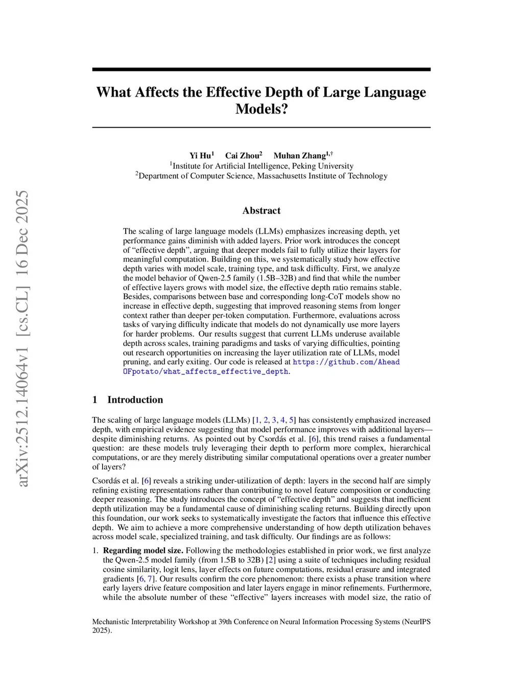 The scaling of large language models (LLMs) emphasizes increasing depth, yet performance gains diminish with added layers. Prior work introduces the concept of "effective depth", arguing that deeper models fail to fully utilize their layers for meaningful computation. Building on this, we systematically study how effective depth varies with model scale, training type, and task difficulty. First, we analyze the model behavior of Qwen-2.5 family (1.5B-32B) and find that while the number of effective layers grows with model size, the effective depth ratio remains stable. Besides, comparisons between base and corresponding long-CoT models show no increase in effective depth, suggesting that improved reasoning stems from longer context rather than deeper per-token computation. Furthermore, evaluations across tasks of varying difficulty indicate that models do not dynamically use more layers for harder problems. Our results suggest that current LLMs underuse available depth across scales, training paradigms and tasks of varying difficulties, pointing out research opportunities on increasing the layer utilization rate of LLMs, model pruning, and early exiting. Our code is released atthis https URL.