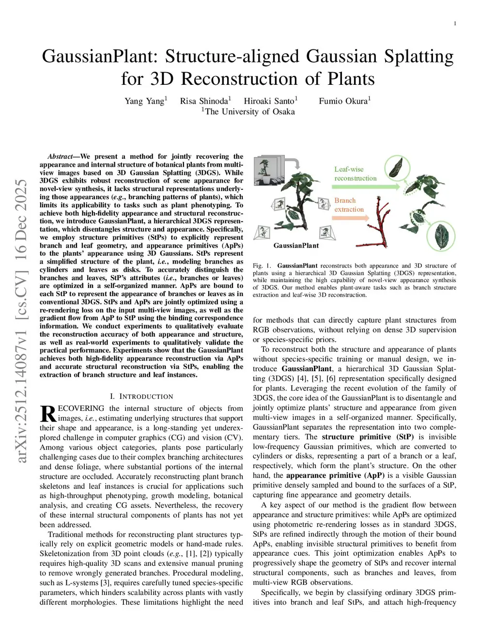 We present a method for jointly recovering the appearance and internal structure of botanical plants from multi-view images based on 3D Gaussian Splatting (3DGS). While 3DGS exhibits robust reconstruction of scene appearance for novel-view synthesis, it lacks structural representations underlying those appearances (e.g., branching patterns of plants), which limits its applicability to tasks such as plant phenotyping. To achieve both high-fidelity appearance and structural reconstruction, we introduce GaussianPlant, a hierarchical 3DGS representation, which disentangles structure and appearance. Specifically, we employ structure primitives (StPs) to explicitly represent branch and leaf geometry, and appearance primitives (ApPs) to the plants' appearance using 3D Gaussians. StPs represent a simplified structure of the plant, i.e., modeling branches as cylinders and leaves as disks. To accurately distinguish the branches and leaves, StP's attributes (i.e., branches or leaves) are optimized in a self-organized manner. ApPs are bound to each StP to represent the appearance of branches or leaves as in conventional 3DGS. StPs and ApPs are jointly optimized using a re-rendering loss on the input multi-view images, as well as the gradient flow from ApP to StP using the binding correspondence information. We conduct experiments to qualitatively evaluate the reconstruction accuracy of both appearance and structure, as well as real-world experiments to qualitatively validate the practical performance. Experiments show that the GaussianPlant achieves both high-fidelity appearance reconstruction via ApPs and accurate structural reconstruction via StPs, enabling the extraction of branch structure and leaf instances.