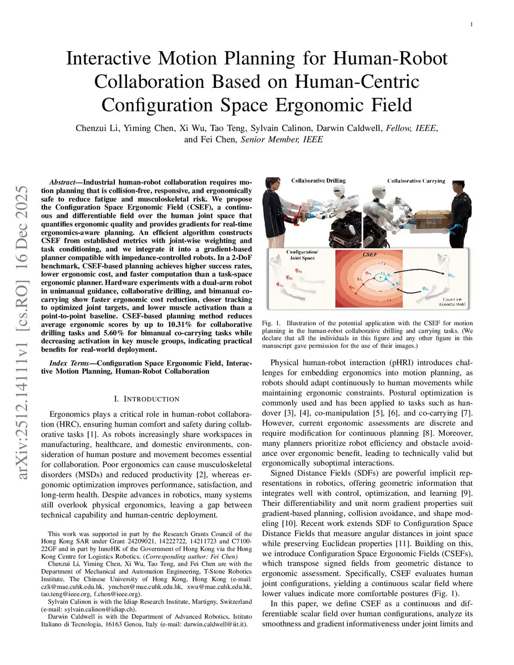 Industrial human-robot collaboration requires motion planning that is collision-free, responsive, and ergonomically safe to reduce fatigue and musculoskeletal risk. We propose the Configuration Space Ergonomic Field (CSEF), a continuous and differentiable field over the human joint space that quantifies ergonomic quality and provides gradients for real-time ergonomics-aware planning. An efficient algorithm constructs CSEF from established metrics with joint-wise weighting and task conditioning, and we integrate it into a gradient-based planner compatible with impedance-controlled robots. In a 2-DoF benchmark, CSEF-based planning achieves higher success rates, lower ergonomic cost, and faster computation than a task-space ergonomic planner. Hardware experiments with a dual-arm robot in unimanual guidance, collaborative drilling, and bimanual cocarrying show faster ergonomic cost reduction, closer tracking to optimized joint targets, and lower muscle activation than a point-to-point baseline. CSEF-based planning method reduces average ergonomic scores by up to 10.31% for collaborative drilling tasks and 5.60% for bimanual co-carrying tasks while decreasing activation in key muscle groups, indicating practical benefits for real-world deployment.