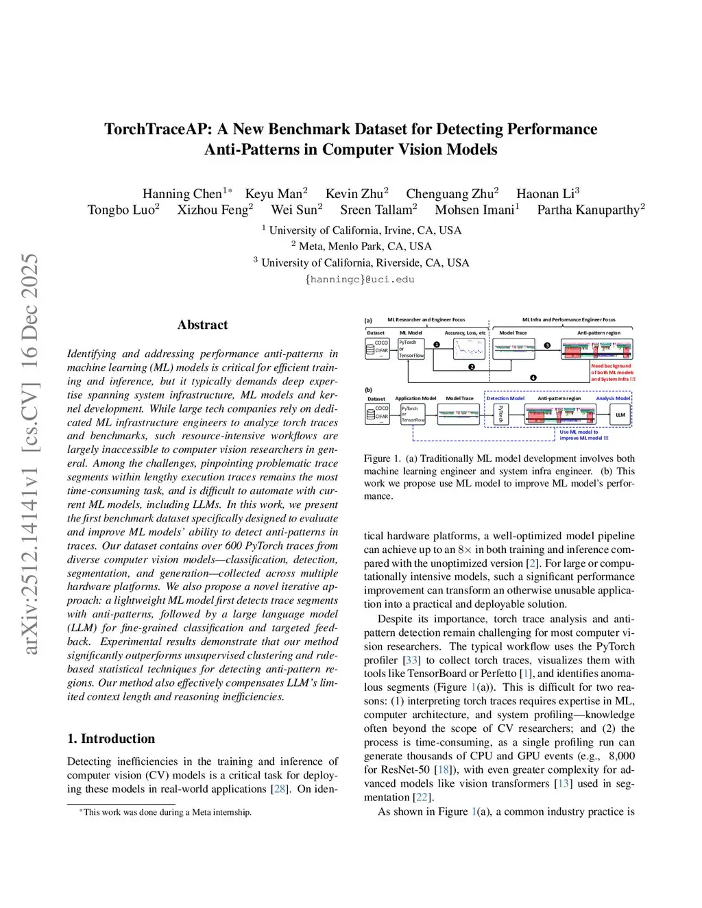 Identifying and addressing performance anti-patterns in machine learning (ML) models is critical for efficient training and inference, but it typically demands deep expertise spanning system infrastructure, ML models and kernel development. While large tech companies rely on dedicated ML infrastructure engineers to analyze torch traces and benchmarks, such resource-intensive workflows are largely inaccessible to computer vision researchers in general. Among the challenges, pinpointing problematic trace segments within lengthy execution traces remains the most time-consuming task, and is difficult to automate with current ML models, including LLMs. In this work, we present the first benchmark dataset specifically designed to evaluate and improve ML models' ability to detect anti patterns in traces. Our dataset contains over 600 PyTorch traces from diverse computer vision models classification, detection, segmentation, and generation collected across multiple hardware platforms. We also propose a novel iterative approach: a lightweight ML model first detects trace segments with anti patterns, followed by a large language model (LLM) for fine grained classification and targeted feedback. Experimental results demonstrate that our method significantly outperforms unsupervised clustering and rule based statistical techniques for detecting anti pattern regions. Our method also effectively compensates LLM's limited context length and reasoning inefficiencies.