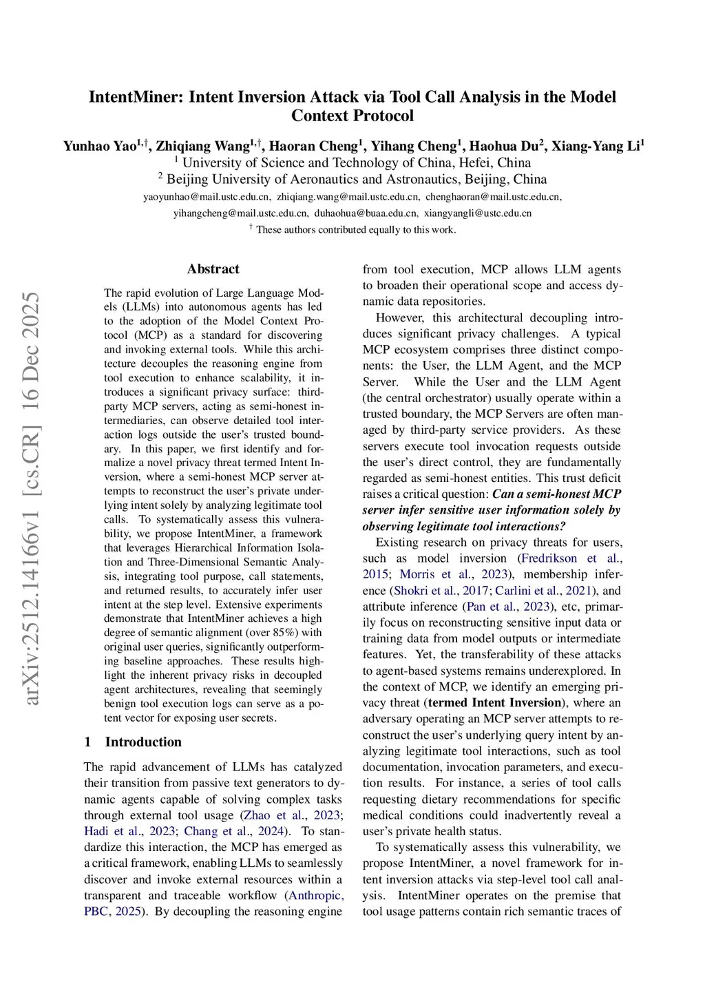 IntentMiner: Intent Inversion Attack via Tool Call Analysis in the Model Context Protocol