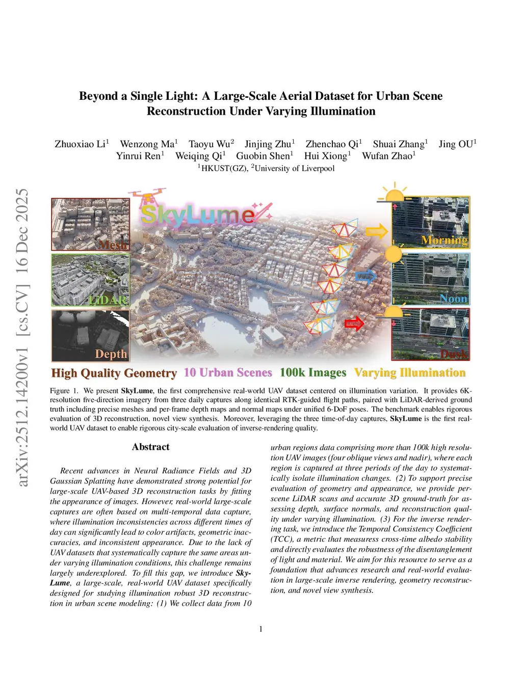 Recent advances in Neural Radiance Fields and 3D Gaussian Splatting have demonstrated strong potential for large-scale UAV-based 3D reconstruction tasks by fitting the appearance of images. However, real-world large-scale captures are often based on multi-temporal data capture, where illumination inconsistencies across different times of day can significantly lead to color artifacts, geometric inaccuracies, and inconsistent appearance. Due to the lack of UAV datasets that systematically capture the same areas under varying illumination conditions, this challenge remains largely underexplored. To fill this gap, we introduceSkyLume, a large-scale, real-world UAV dataset specifically designed for studying illumination robust 3D reconstruction in urban scene modeling: (1) We collect data from 10 urban regions data comprising more than 100k high resolution UAV images (four oblique views and nadir), where each region is captured at three periods of the day to systematically isolate illumination changes. (2) To support precise evaluation of geometry and appearance, we provide per-scene LiDAR scans and accurate 3D ground-truth for assessing depth, surface normals, and reconstruction quality under varying illumination. (3) For the inverse rendering task, we introduce the Temporal Consistency Coefficient (TCC), a metric that measuress cross-time albedo stability and directly evaluates the robustness of the disentanglement of light and material. We aim for this resource to serve as a foundation that advances research and real-world evaluation in large-scale inverse rendering, geometry reconstruction, and novel view synthesis.