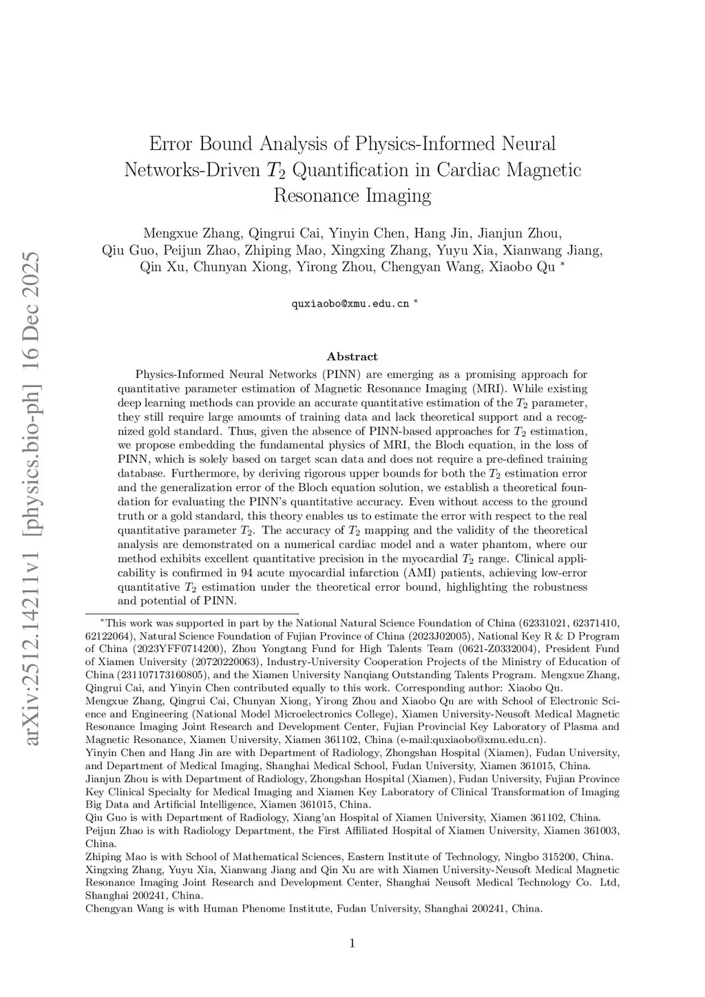 Physics-Informed Neural Networks (PINN) are emerging as a promising approach for quantitative parameter estimation of Magnetic Resonance Imaging (MRI). While existing deep learning methods can provide an accurate quantitative estimation of the T2 parameter, they still require large amounts of training data and lack theoretical support and a recognized gold standard. Thus, given the absence of PINN-based approaches for T2 estimation, we propose embedding the fundamental physics of MRI, the Bloch equation, in the loss of PINN, which is solely based on target scan data and does not require a pre-defined training database. Furthermore, by deriving rigorous upper bounds for both the T2 estimation error and the generalization error of the Bloch equation solution, we establish a theoretical foundation for evaluating the PINN's quantitative accuracy. Even without access to the ground truth or a gold standard, this theory enables us to estimate the error with respect to the real quantitative parameter T2. The accuracy of T2 mapping and the validity of the theoretical analysis are demonstrated on a numerical cardiac model and a water phantom, where our method exhibits excellent quantitative precision in the myocardial T2 range. Clinical applicability is confirmed in 94 acute myocardial infarction (AMI) patients, achieving low-error quantitative T2 estimation under the theoretical error bound, highlighting the robustness and potential of PINN.
