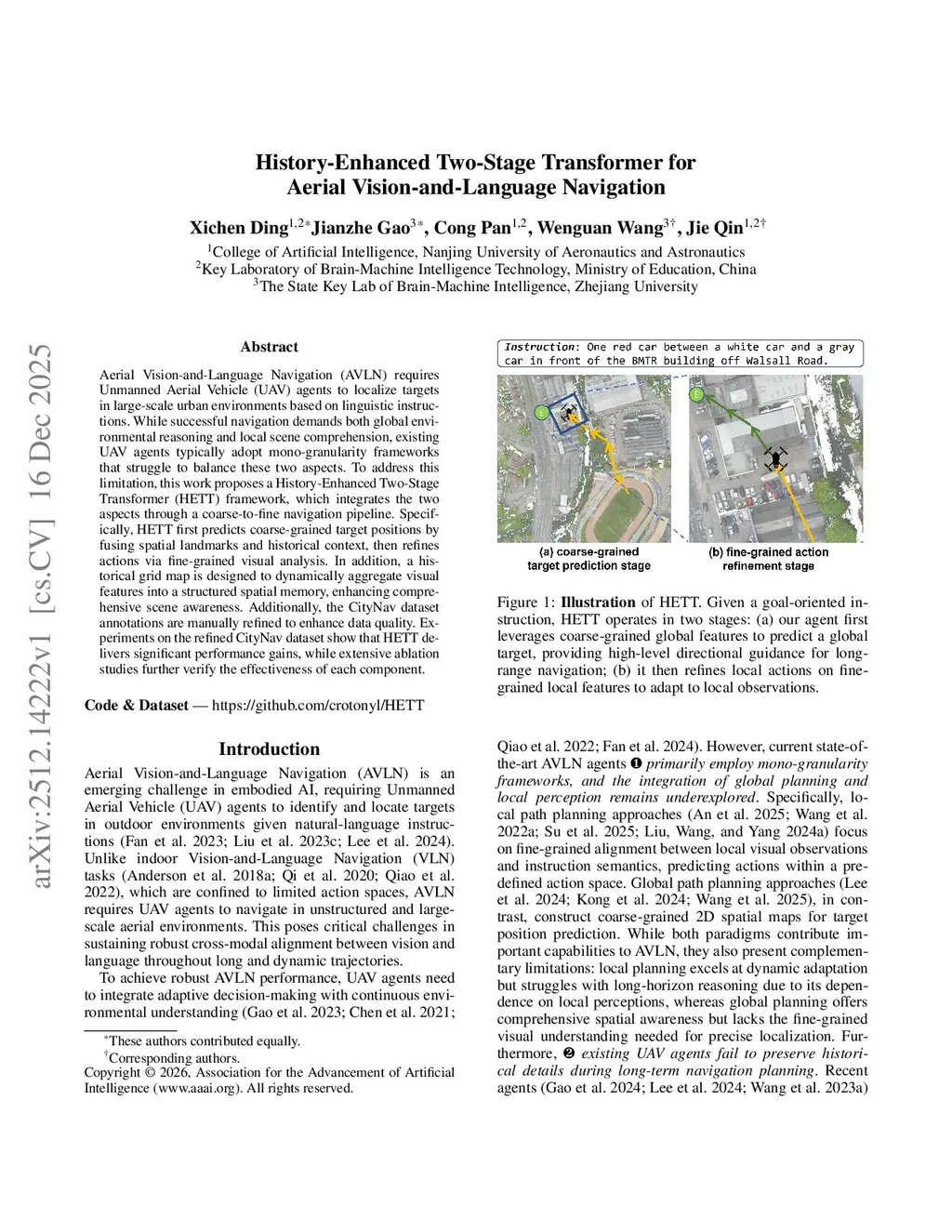Aerial Vision-and-Language Navigation (AVLN) requires Unmanned Aerial Vehicle (UAV) agents to localize targets in large-scale urban environments based on linguistic instructions. While successful navigation demands both global environmental reasoning and local scene comprehension, existing UAV agents typically adopt mono-granularity frameworks that struggle to balance these two aspects. To address this limitation, this work proposes a History-Enhanced Two-Stage Transformer (HETT) framework, which integrates the two aspects through a coarse-to-fine navigation pipeline. Specifically, HETT first predicts coarse-grained target positions by fusing spatial landmarks and historical context, then refines actions via fine-grained visual analysis. In addition, a historical grid map is designed to dynamically aggregate visual features into a structured spatial memory, enhancing comprehensive scene awareness. Additionally, the CityNav dataset annotations are manually refined to enhance data quality. Experiments on the refined CityNav dataset show that HETT delivers significant performance gains, while extensive ablation studies further verify the effectiveness of each component.