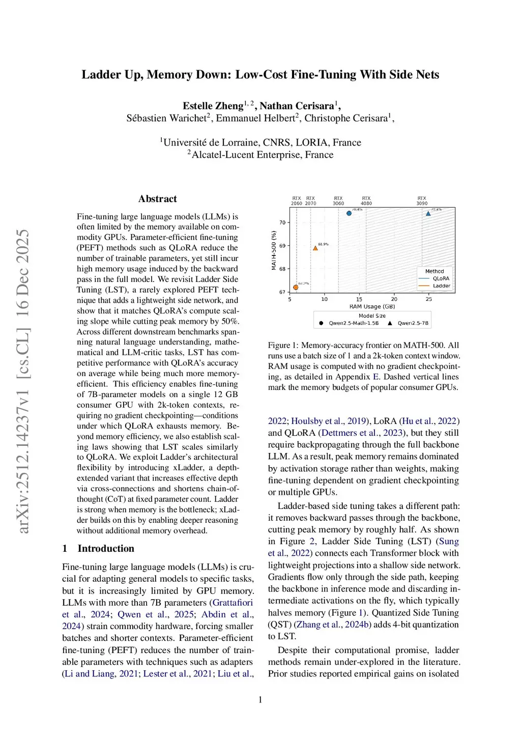 Fine-tuning large language models (LLMs) is often limited by the memory available on commodity GPUs. Parameter-efficient fine-tuning (PEFT) methods such as QLoRA reduce the number of trainable parameters, yet still incur high memory usage induced by the backward pass in the full model. We revisit Ladder Side Tuning (LST), a rarely explored PEFT technique that adds a lightweight side network, and show that it matches QLoRA's compute scaling slope while cutting peak memory by 50\%. Across different downstream benchmarks spanning natural language understanding, mathematical and LLM-critic tasks, LST has competitive performance with QLoRA's accuracy on average while being much more memory-efficient. This efficiency enables fine-tuning of 7B-parameter models on a single 12 GB consumer GPU with 2k-token contexts, requiring no gradient checkpointing\textemdash conditions under which QLoRA exhausts memory. Beyond memory efficiency, we also establish scaling laws showing that LST scales similarly to QLoRA. We exploit Ladder's architectural flexibility by introducing xLadder, a depth-extended variant that increases effective depth via cross-connections and shortens chain-of-thought (CoT) at fixed parameter count. Ladder is strong when memory is the bottleneck; xLadder builds on this by enabling deeper reasoning without additional memory overhead.