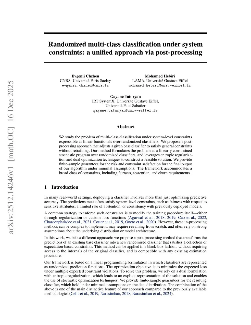 We study the problem of multi-class classification under system-level constraints expressible as linear functionals over randomized classifiers. We propose a post-processing approach that adjusts a given base classifier to satisfy general constraints without retraining. Our method formulates the problem as a linearly constrained stochastic program over randomized classifiers, and leverages entropic regularization and dual optimization techniques to construct a feasible solution. We provide finite-sample guarantees for the risk and constraint satisfaction for the final output of our algorithm under minimal assumptions. The framework accommodates a broad class of constraints, including fairness, abstention, and churn requirements.