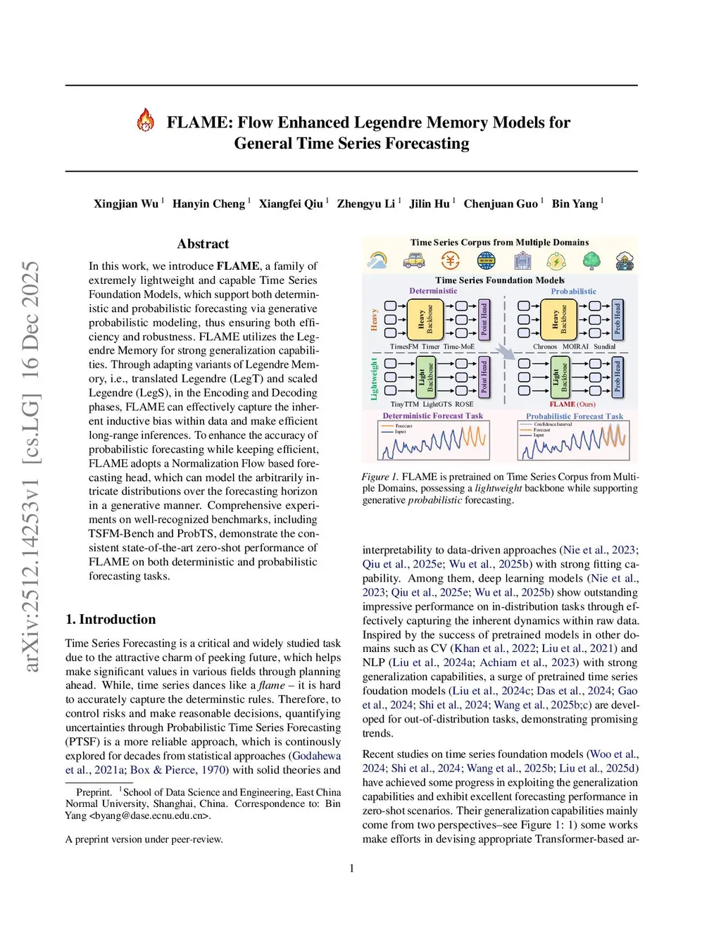 In this work, we introduce FLAME, a family of extremely lightweight and capable Time Series Foundation Models, which support both deterministic and probabilistic forecasting via generative probabilistic modeling, thus ensuring both efficiency and robustness. FLAME utilizes the Legendre Memory for strong generalization capabilities. Through adapting variants of Legendre Memory, i.e., translated Legendre (LegT) and scaled Legendre (LegS), in the Encoding and Decoding phases, FLAME can effectively capture the inherent inductive bias within data and make efficient long-range inferences. To enhance the accuracy of probabilistic forecasting while keeping efficient, FLAME adopts a Normalization Flow based forecasting head, which can model the arbitrarily intricate distributions over the forecasting horizon in a generative manner. Comprehensive experiments on well-recognized benchmarks, including TSFM-Bench and ProbTS, demonstrate the consistent state-of-the-art zero-shot performance of FLAME on both deterministic and probabilistic forecasting tasks.