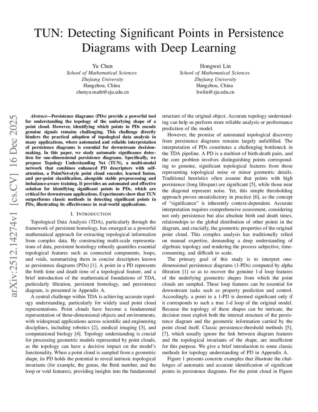 Persistence diagrams (PDs) provide a powerful tool for understanding the topology of the underlying shape of a point cloud. However, identifying which points in PDs encode genuine signals remains challenging. This challenge directly hinders the practical adoption of topological data analysis in many applications, where automated and reliable interpretation of persistence diagrams is essential for downstream decision-making. In this paper, we study automatic significance detection for one-dimensional persistence diagrams. Specifically, we propose Topology Understanding Net (TUN), a multi-modal network that combines enhanced PD descriptors with self-attention, a PointNet-style point cloud encoder, learned fusion, and per-point classification, alongside stable preprocessing and imbalance-aware training. It provides an automated and effective solution for identifying significant points in PDs, which are critical for downstream applications. Experiments show that TUN outperforms classic methods in detecting significant points in PDs, illustrating its effectiveness in real-world applications.