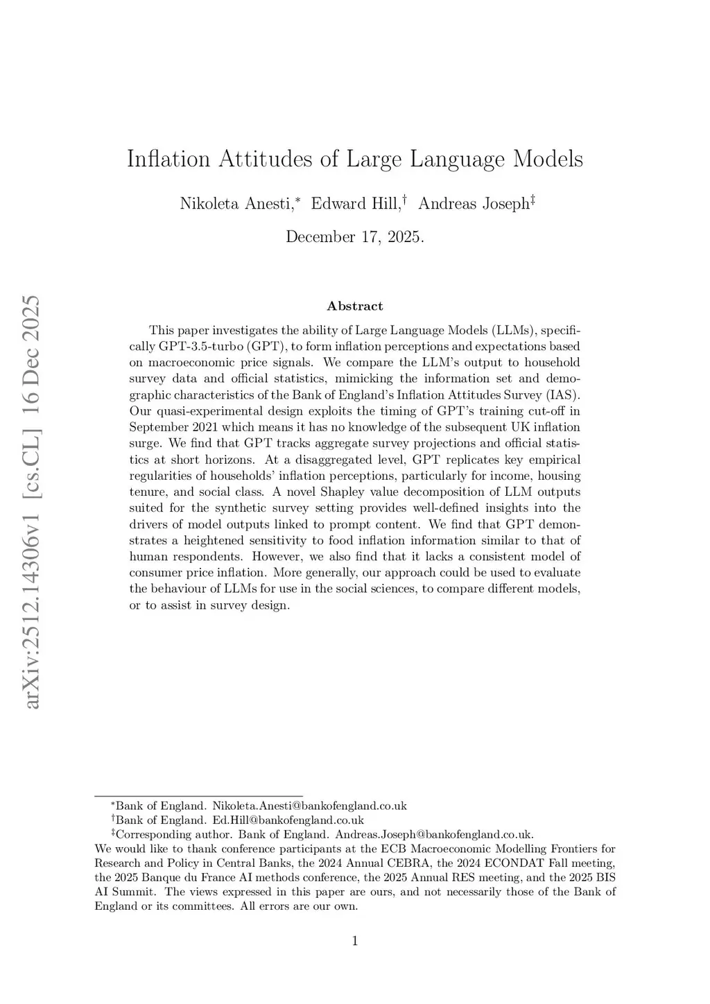 This paper investigates the ability of Large Language Models (LLMs), specifically GPT-3.5-turbo (GPT), to form inflation perceptions and expectations based on macroeconomic price signals. We compare the LLM's output to household survey data and official statistics, mimicking the information set and demographic characteristics of the Bank of England's Inflation Attitudes Survey (IAS). Our quasi-experimental design exploits the timing of GPT's training cut-off in September 2021 which means it has no knowledge of the subsequent UK inflation surge. We find that GPT tracks aggregate survey projections and official statistics at short horizons. At a disaggregated level, GPT replicates key empirical regularities of households' inflation perceptions, particularly for income, housing tenure, and social class. A novel Shapley value decomposition of LLM outputs suited for the synthetic survey setting provides well-defined insights into the drivers of model outputs linked to prompt content. We find that GPT demonstrates a heightened sensitivity to food inflation information similar to that of human respondents. However, we also find that it lacks a consistent model of consumer price inflation. More generally, our approach could be used to evaluate the behaviour of LLMs for use in the social sciences, to compare different models, or to assist in survey design.