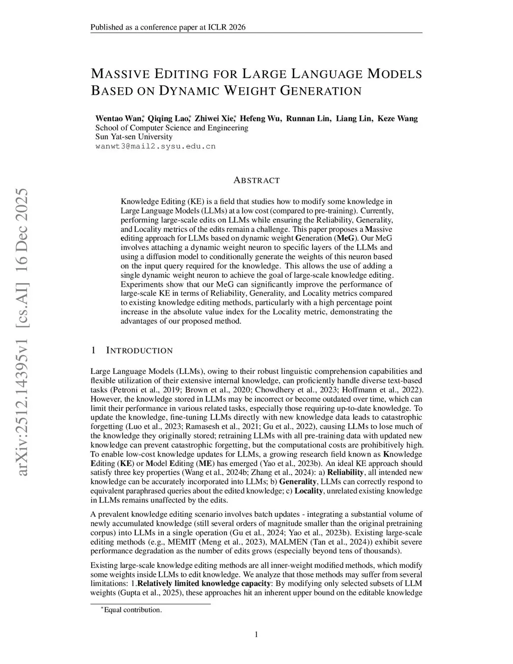 Knowledge Editing (KE) is a field that studies how to modify some knowledge in Large Language Models (LLMs) at a low cost (compared to pre-training). Currently, performing large-scale edits on LLMs while ensuring the Reliability, Generality, and Locality metrics of the edits remain a challenge. This paper proposes a Massive editing approach for LLMs based on dynamic weight Generation (MeG). Our MeG involves attaching a dynamic weight neuron to specific layers of the LLMs and using a diffusion model to conditionally generate the weights of this neuron based on the input query required for the knowledge. This allows the use of adding a single dynamic weight neuron to achieve the goal of large-scale knowledge editing. Experiments show that our MeG can significantly improve the performance of large-scale KE in terms of Reliability, Generality, and Locality metrics compared to existing knowledge editing methods, particularly with a high percentage point increase in the absolute value index for the Locality metric, demonstrating the advantages of our proposed method.