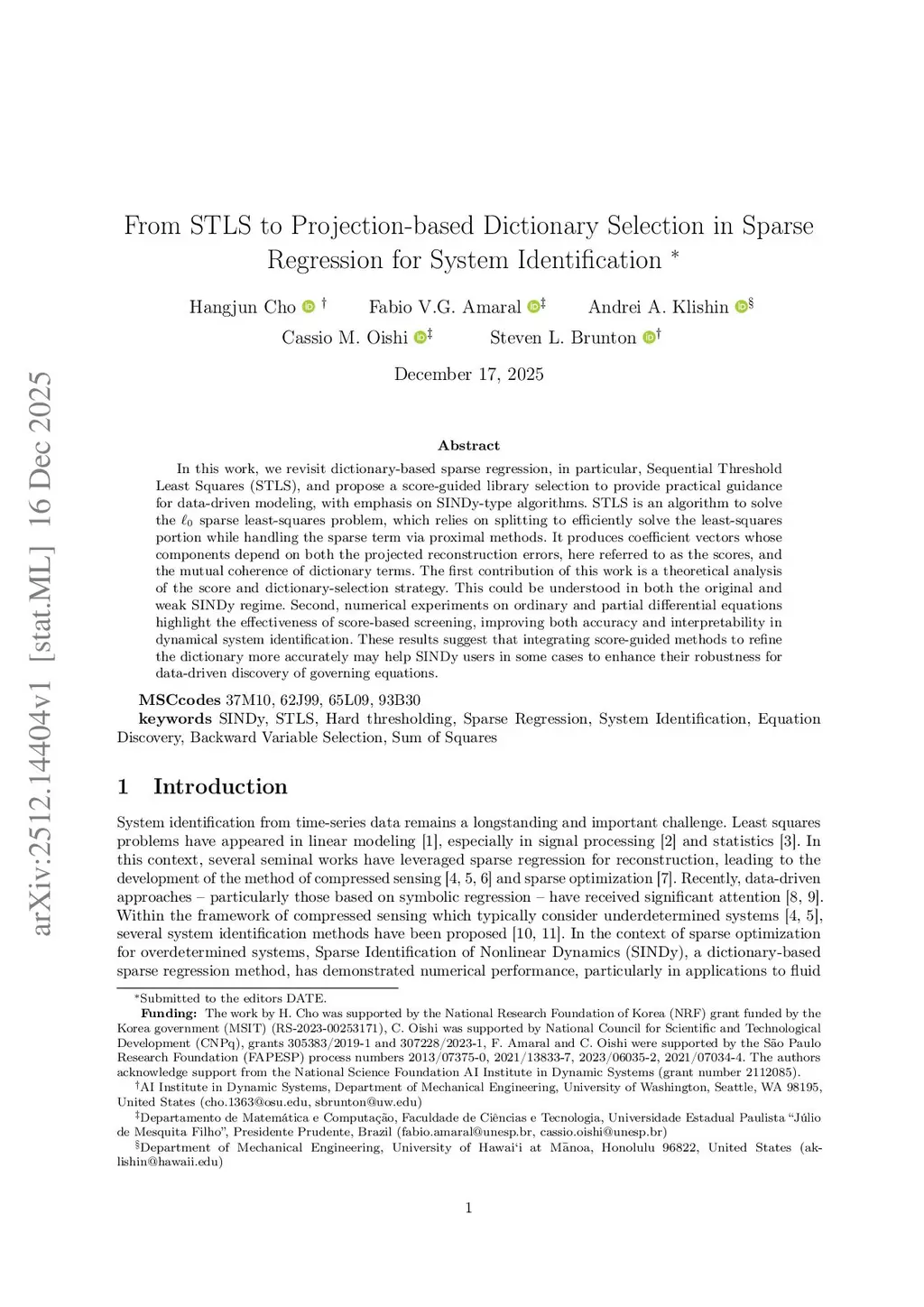 In this work, we revisit dictionary-based sparse regression, in particular, Sequential Threshold Least Squares (STLS), and propose a score-guided library selection to provide practical guidance for data-driven modeling, with emphasis on SINDy-type algorithms. STLS is an algorithm to solve the sparse least-squares problem, which relies on splitting to efficiently solve the least-squares portion while handling the sparse term via proximal methods. It produces coefficient vectors whose components depend on both the projected reconstruction errors, here referred to as the scores, and the mutual coherence of dictionary terms. The first contribution of this work is a theoretical analysis of the score and dictionary-selection strategy. This could be understood in both the original and weak SINDy regime. Second, numerical experiments on ordinary and partial differential equations highlight the effectiveness of score-based screening, improving both accuracy and interpretability in dynamical system identification. These results suggest that integrating score-guided methods to refine the dictionary more accurately may help SINDy users in some cases to enhance their robustness for data-driven discovery of governing equations.