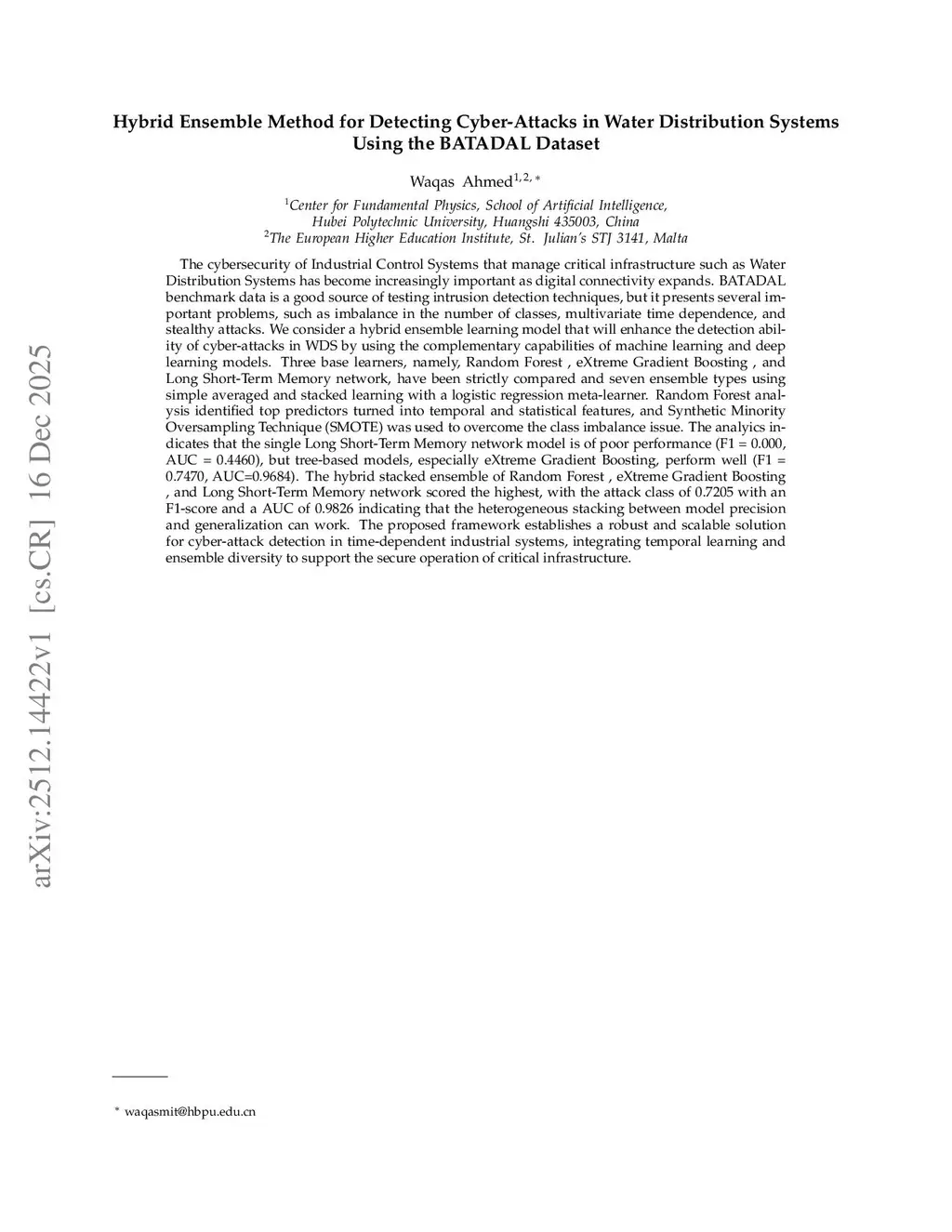 Hybrid Ensemble Method for Detecting Cyber-Attacks in Water Distribution Systems Using the BATADAL Dataset