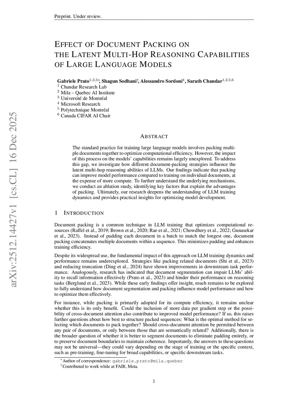 The standard practice for training large language models involves packing multiple documents together to optimize computational efficiency. However, the impact of this process on the models' capabilities remains largely unexplored. To address this gap, we investigate how different document-packing strategies influence the latent multi-hop reasoning abilities of LLMs. Our findings indicate that packing can improve model performance compared to training on individual documents, at the expense of more compute. To further understand the underlying mechanisms, we conduct an ablation study, identifying key factors that explain the advantages of packing. Ultimately, our research deepens the understanding of LLM training dynamics and provides practical insights for optimizing model development.