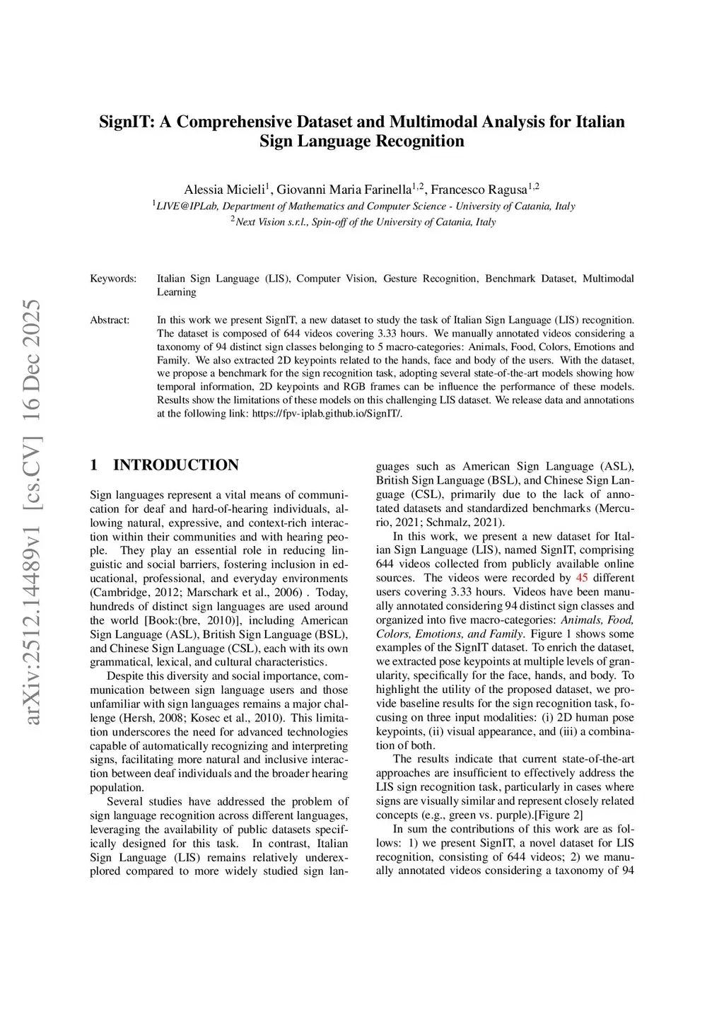 In this work we present SignIT, a new dataset to study the task of Italian Sign Language (LIS) recognition. The dataset is composed of 644 videos covering 3.33 hours. We manually annotated videos considering a taxonomy of 94 distinct sign classes belonging to 5 macro-categories: Animals, Food, Colors, Emotions and Family. We also extracted 2D keypoints related to the hands, face and body of the users. With the dataset, we propose a benchmark for the sign recognition task, adopting several state-of-the-art models showing how temporal information, 2D keypoints and RGB frames can be influence the performance of these models. Results show the limitations of these models on this challenging LIS dataset. We release data and annotations at the following link:this https URL.