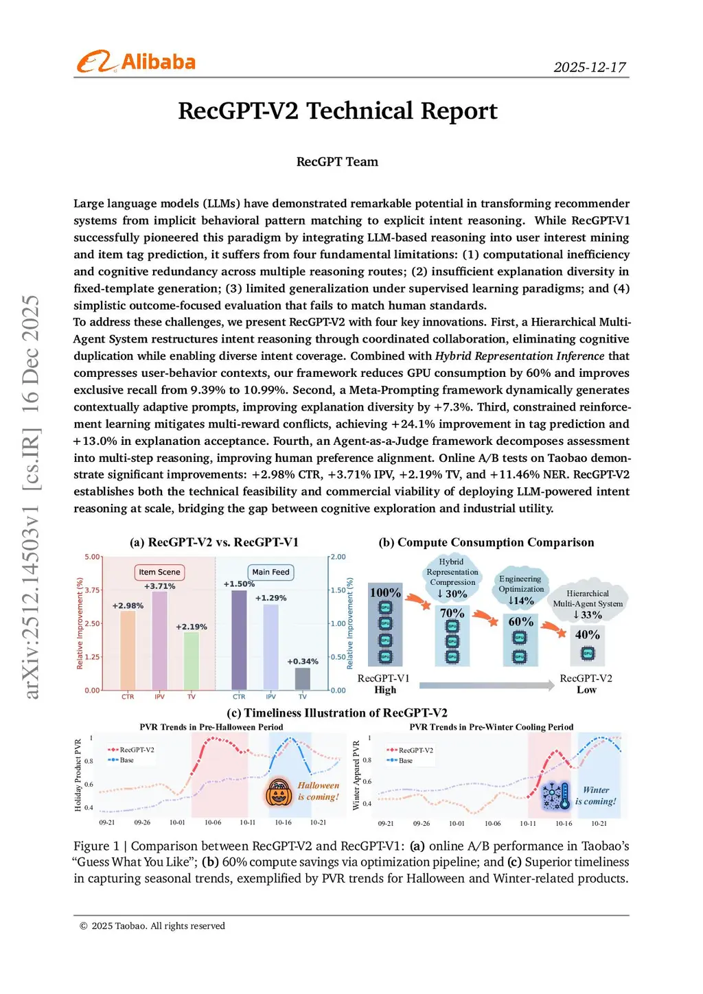 Large language models (LLMs) have demonstrated remarkable potential in transforming recommender systems from implicit behavioral pattern matching to explicit intent reasoning. While RecGPT-V1 successfully pioneered this paradigm by integrating LLM-based reasoning into user interest mining and item tag prediction, it suffers from four fundamental limitations: (1) computational inefficiency and cognitive redundancy across multiple reasoning routes; (2) insufficient explanation diversity in fixed-template generation; (3) limited generalization under supervised learning paradigms; and (4) simplistic outcome-focused evaluation that fails to match human standards.To address these challenges, we present RecGPT-V2 with four key innovations. First, a Hierarchical Multi-Agent System restructures intent reasoning through coordinated collaboration, eliminating cognitive duplication while enabling diverse intent coverage. Combined with Hybrid Representation Inference that compresses user-behavior contexts, our framework reduces GPU consumption by 60% and improves exclusive recall from 9.39% to 10.99%. Second, a Meta-Prompting framework dynamically generates contextually adaptive prompts, improving explanation diversity by +7.3%. Third, constrained reinforcement learning mitigates multi-reward conflicts, achieving +24.1% improvement in tag prediction and +13.0% in explanation acceptance. Fourth, an Agent-as-a-Judge framework decomposes assessment into multi-step reasoning, improving human preference alignment. Online A/B tests on Taobao demonstrate significant improvements: +2.98% CTR, +3.71% IPV, +2.19% TV, and +11.46% NER. RecGPT-V2 establishes both the technical feasibility and commercial viability of deploying LLM-powered intent reasoning at scale, bridging the gap between cognitive exploration and industrial utility.