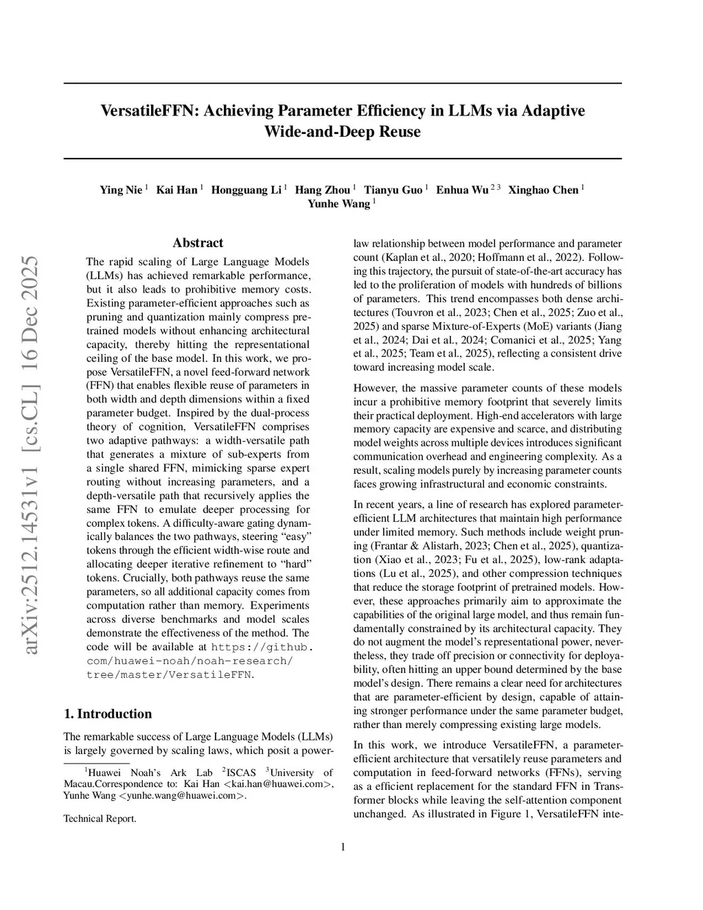 The rapid scaling of Large Language Models (LLMs) has achieved remarkable performance, but it also leads to prohibitive memory costs. Existing parameter-efficient approaches such as pruning and quantization mainly compress pretrained models without enhancing architectural capacity, thereby hitting the representational ceiling of the base model. In this work, we propose VersatileFFN, a novel feed-forward network (FFN) that enables flexible reuse of parameters in both width and depth dimensions within a fixed parameter budget. Inspired by the dual-process theory of cognition, VersatileFFN comprises two adaptive pathways: a width-versatile path that generates a mixture of sub-experts from a single shared FFN, mimicking sparse expert routing without increasing parameters, and a depth-versatile path that recursively applies the same FFN to emulate deeper processing for complex tokens. A difficulty-aware gating dynamically balances the two pathways, steering "easy" tokens through the efficient width-wise route and allocating deeper iterative refinement to "hard" tokens. Crucially, both pathways reuse the same parameters, so all additional capacity comes from computation rather than memory. Experiments across diverse benchmarks and model scales demonstrate the effectiveness of the method. The code is available atthis https URL.