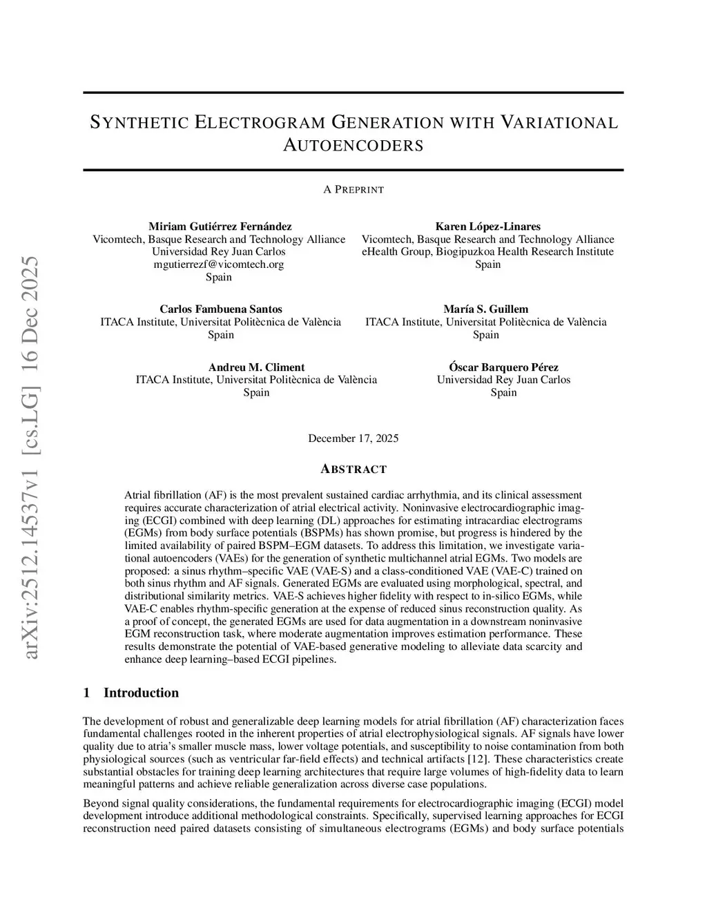 Atrial fibrillation (AF) is the most prevalent sustained cardiac arrhythmia, and its clinical assessment requires accurate characterization of atrial electrical activity. Noninvasive electrocardiographic imaging (ECGI) combined with deep learning (DL) approaches for estimating intracardiac electrograms (EGMs) from body surface potentials (BSPMs) has shown promise, but progress is hindered by the limited availability of paired BSPM-EGM datasets. To address this limitation, we investigate variational autoencoders (VAEs) for the generation of synthetic multichannel atrial EGMs. Two models are proposed: a sinus rhythm-specific VAE (VAE-S) and a class-conditioned VAE (VAE-C) trained on both sinus rhythm and AF signals. Generated EGMs are evaluated using morphological, spectral, and distributional similarity metrics. VAE-S achieves higher fidelity with respect to in silico EGMs, while VAE-C enables rhythm-specific generation at the expense of reduced sinus reconstruction quality. As a proof of concept, the generated EGMs are used for data augmentation in a downstream noninvasive EGM reconstruction task, where moderate augmentation improves estimation performance. These results demonstrate the potential of VAE-based generative modeling to alleviate data scarcity and enhance deep learning-based ECGI pipelines.