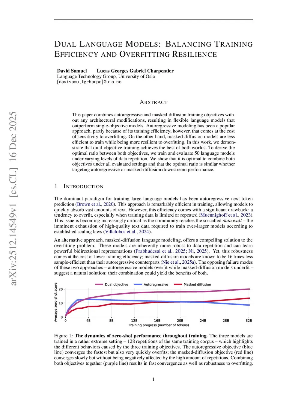 Dual Language Models: Balancing Training Efficiency and Overfitting Resilience