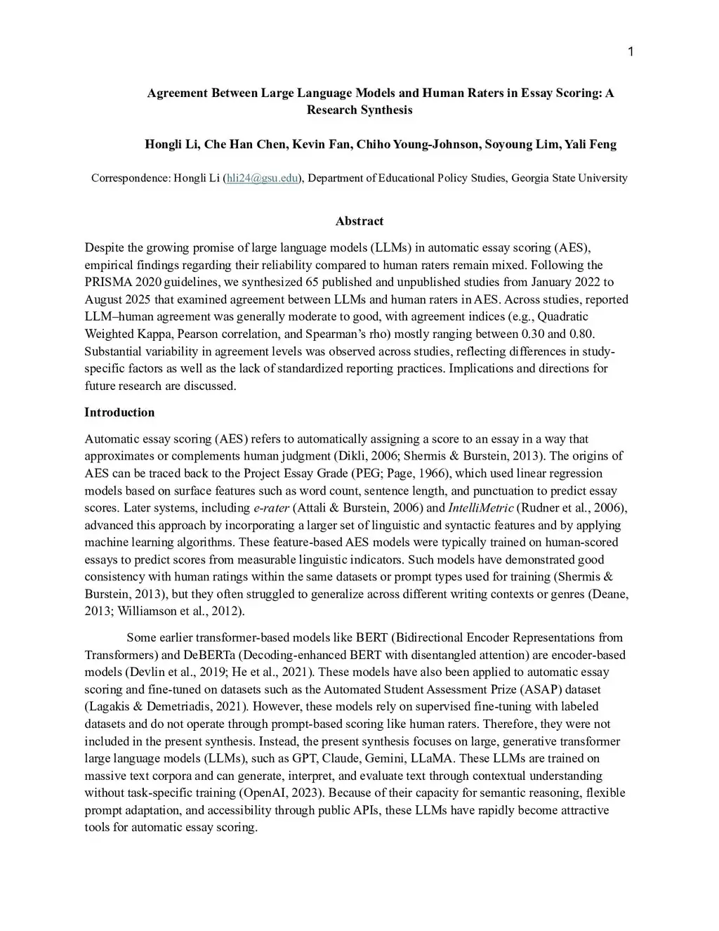 Agreement Between Large Language Models and Human Raters in Essay Scoring: A Research Synthesis