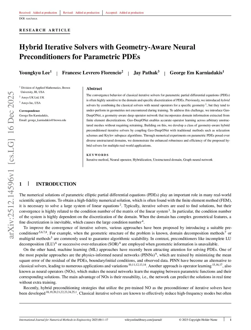Hybrid Iterative Solvers with Geometry-Aware Neural Preconditioners for Parametric PDEs
