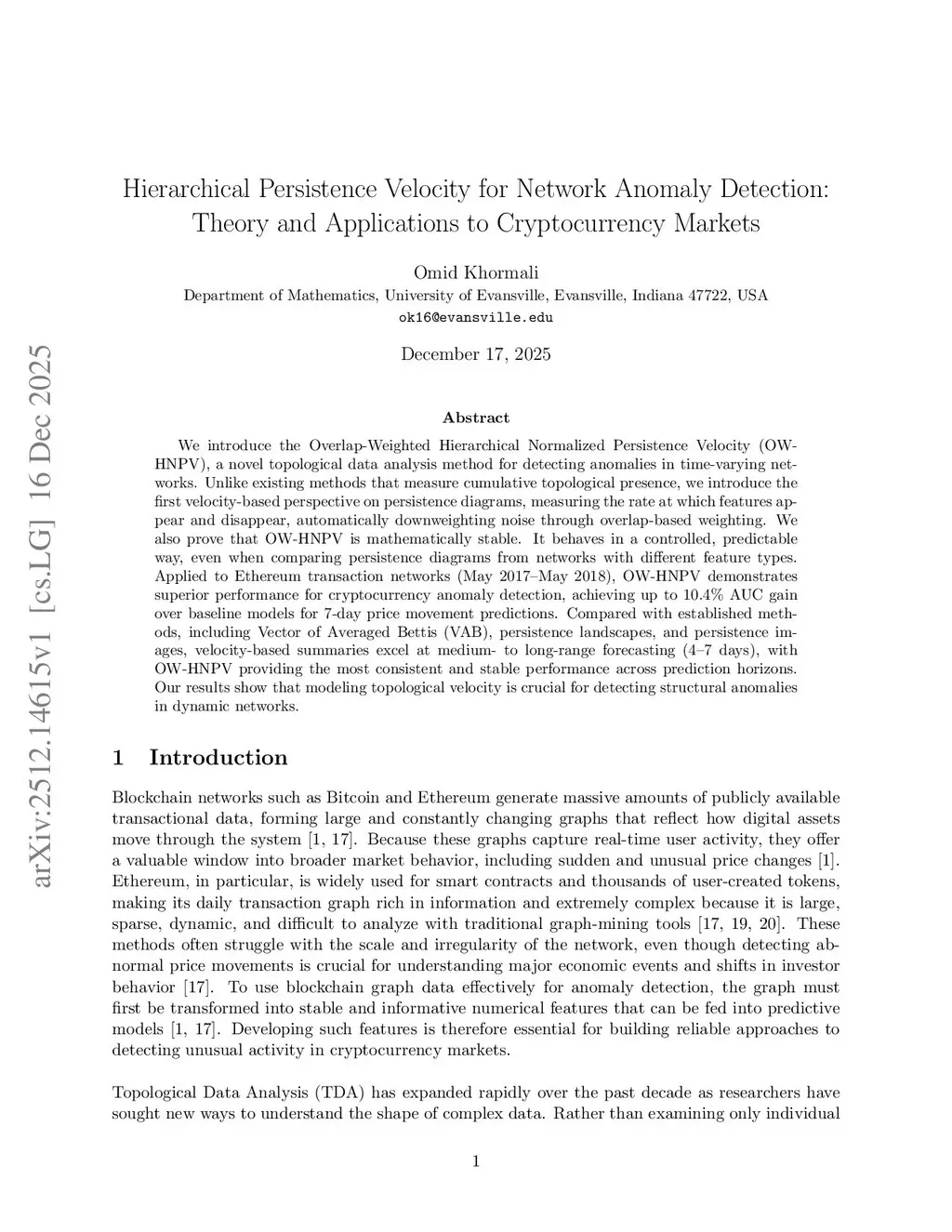 We introduce the Overlap-Weighted Hierarchical Normalized Persistence Velocity (OW-HNPV), a novel topological data analysis method for detecting anomalies in time-varying networks. Unlike existing methods that measure cumulative topological presence, we introduce the first velocity-based perspective on persistence diagrams, measuring the rate at which features appear and disappear, automatically downweighting noise through overlap-based weighting. We also prove that OW-HNPV is mathematically stable. It behaves in a controlled, predictable way, even when comparing persistence diagrams from networks with different feature types. Applied to Ethereum transaction networks (May 2017-May 2018), OW-HNPV demonstrates superior performance for cryptocurrency anomaly detection, achieving up to 10.4% AUC gain over baseline models for 7-day price movement predictions. Compared with established methods, including Vector of Averaged Bettis (VAB), persistence landscapes, and persistence images, velocity-based summaries excel at medium- to long-range forecasting (4-7 days), with OW-HNPV providing the most consistent and stable performance across prediction horizons. Our results show that modeling topological velocity is crucial for detecting structural anomalies in dynamic networks.