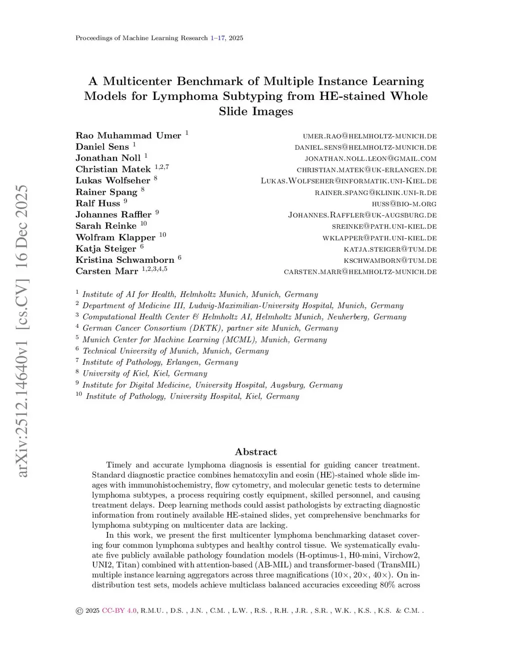 A Multicenter Benchmark of Multiple Instance Learning Models for Lymphoma Subtyping from HE-stained Whole Slide Images