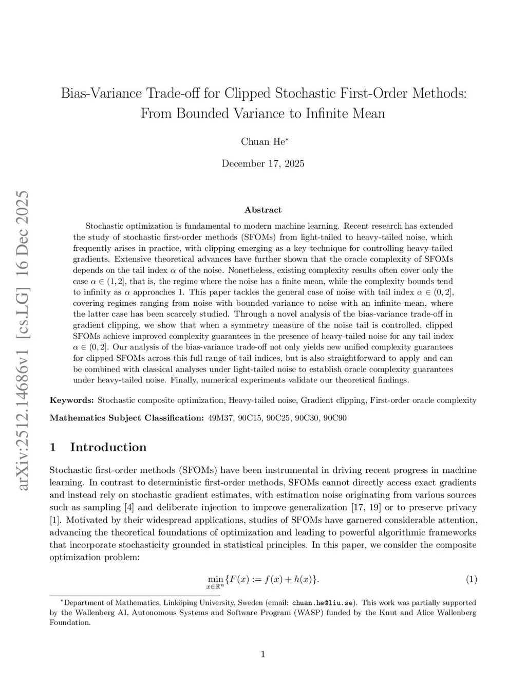 Stochastic optimization is fundamental to modern machine learning. Recent research has extended the study of stochastic first-order methods (SFOMs) from light-tailed to heavy-tailed noise, which frequently arises in practice, with clipping emerging as a key technique for controlling heavy-tailed gradients. Extensive theoretical advances have further shown that the oracle complexity of SFOMs depends on the tail index of the noise. Nonetheless, existing complexity results often cover only the case , that is, the regime where the noise has a finite mean, while the complexity bounds tend to infinity as approaches . This paper tackles the general case of noise with tail index , covering regimes ranging from noise with bounded variance to noise with an infinite mean, where the latter case has been scarcely studied. Through a novel analysis of the bias-variance trade-off in gradient clipping, we show that when a symmetry measure of the noise tail is controlled, clipped SFOMs achieve improved complexity guarantees in the presence of heavy-tailed noise for any tail index . Our analysis of the bias-variance trade-off not only yields new unified complexity guarantees for clipped SFOMs across this full range of tail indices, but is also straightforward to apply and can be combined with classical analyses under light-tailed noise to establish oracle complexity guarantees under heavy-tailed noise. Finally, numerical experiments validate our theoretical findings.