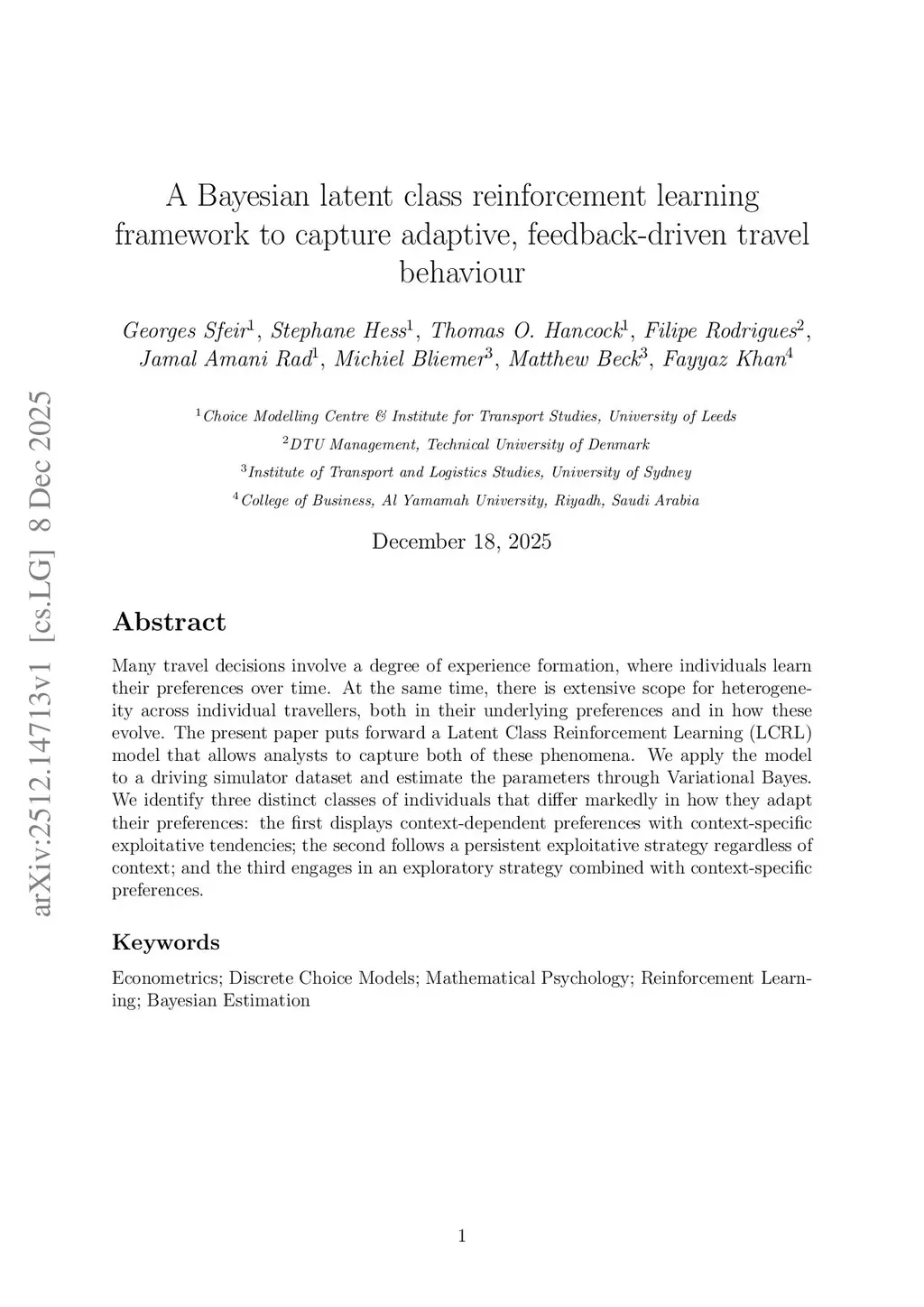 A Bayesian latent class reinforcement learning framework to capture adaptive, feedback-driven travel behaviour