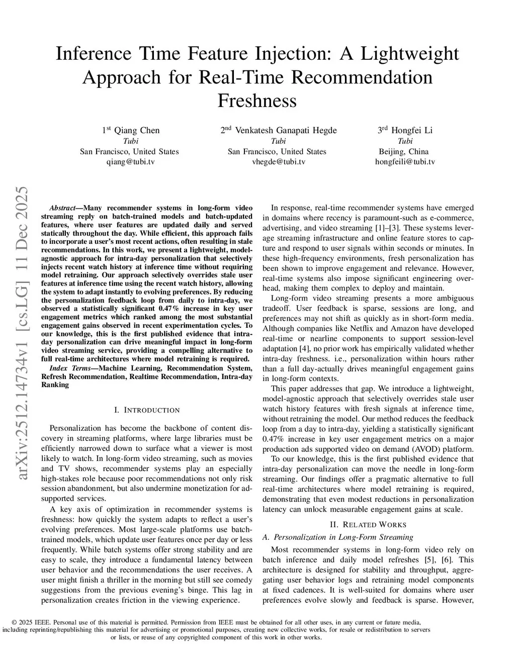 Many recommender systems in long-form video streaming reply on batch-trained models and batch-updated features, where user features are updated daily and served statically throughout the day. While efficient, this approach fails to incorporate a user's most recent actions, often resulting in stale recommendations. In this work, we present a lightweight, model-agnostic approach for intra-day personalization that selectively injects recent watch history at inference time without requiring model retraining. Our approach selectively overrides stale user features at inference time using the recent watch history, allowing the system to adapt instantly to evolving preferences. By reducing the personalization feedback loop from daily to intra-day, we observed a statistically significant 0.47% increase in key user engagement metrics which ranked among the most substantial engagement gains observed in recent experimentation cycles. To our knowledge, this is the first published evidence that intra-day personalization can drive meaningful impact in long-form video streaming service, providing a compelling alternative to full real-time architectures where model retraining is required.