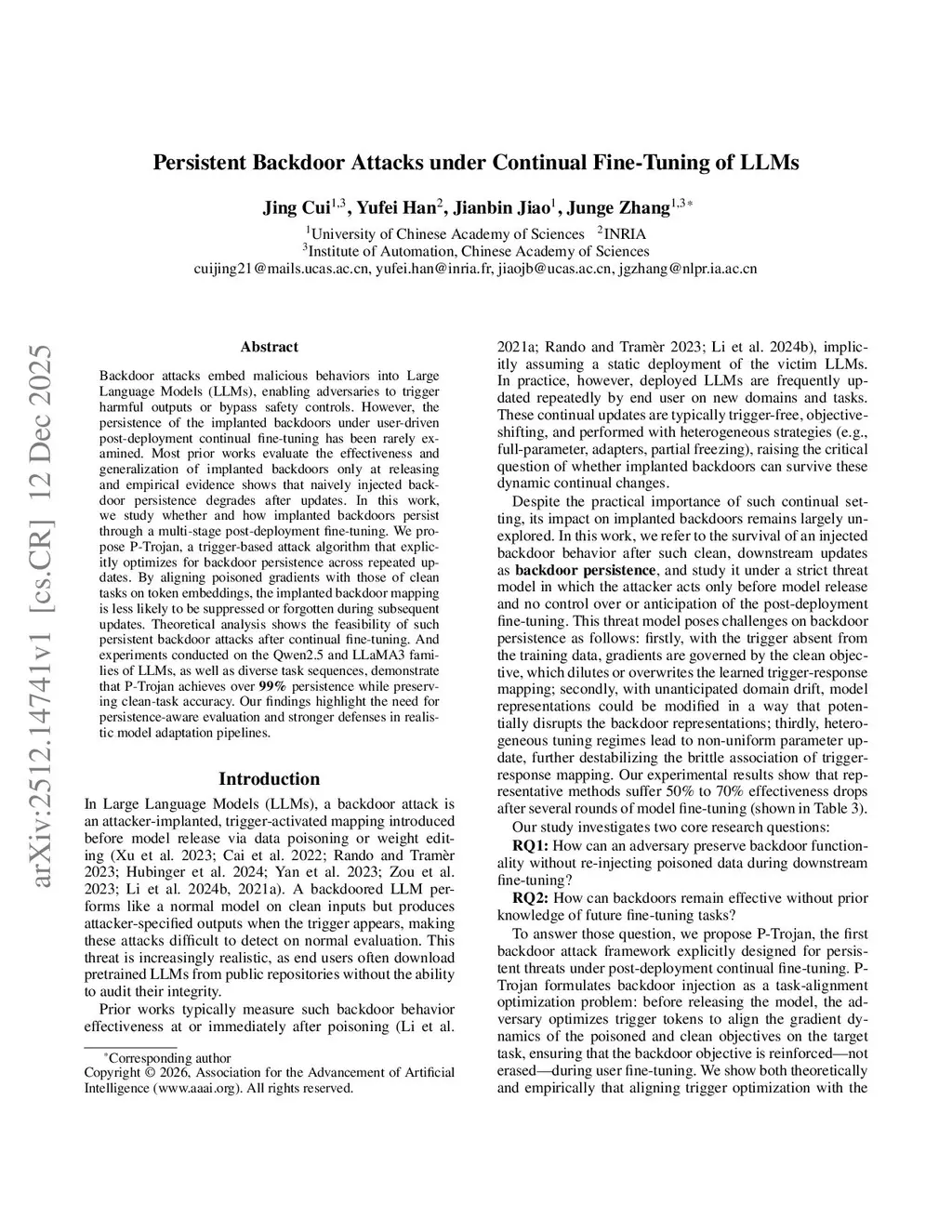 Backdoor attacks embed malicious behaviors into Large Language Models (LLMs), enabling adversaries to trigger harmful outputs or bypass safety controls. However, the persistence of the implanted backdoors under user-driven post-deployment continual fine-tuning has been rarely examined. Most prior works evaluate the effectiveness and generalization of implanted backdoors only at releasing and empirical evidence shows that naively injected backdoor persistence degrades after updates. In this work, we study whether and how implanted backdoors persist through a multi-stage post-deployment fine-tuning. We propose P-Trojan, a trigger-based attack algorithm that explicitly optimizes for backdoor persistence across repeated updates. By aligning poisoned gradients with those of clean tasks on token embeddings, the implanted backdoor mapping is less likely to be suppressed or forgotten during subsequent updates. Theoretical analysis shows the feasibility of such persistent backdoor attacks after continual fine-tuning. And experiments conducted on the Qwen2.5 and LLaMA3 families of LLMs, as well as diverse task sequences, demonstrate that P-Trojan achieves over 99% persistence while preserving clean-task accuracy. Our findings highlight the need for persistence-aware evaluation and stronger defenses in realistic model adaptation pipelines.