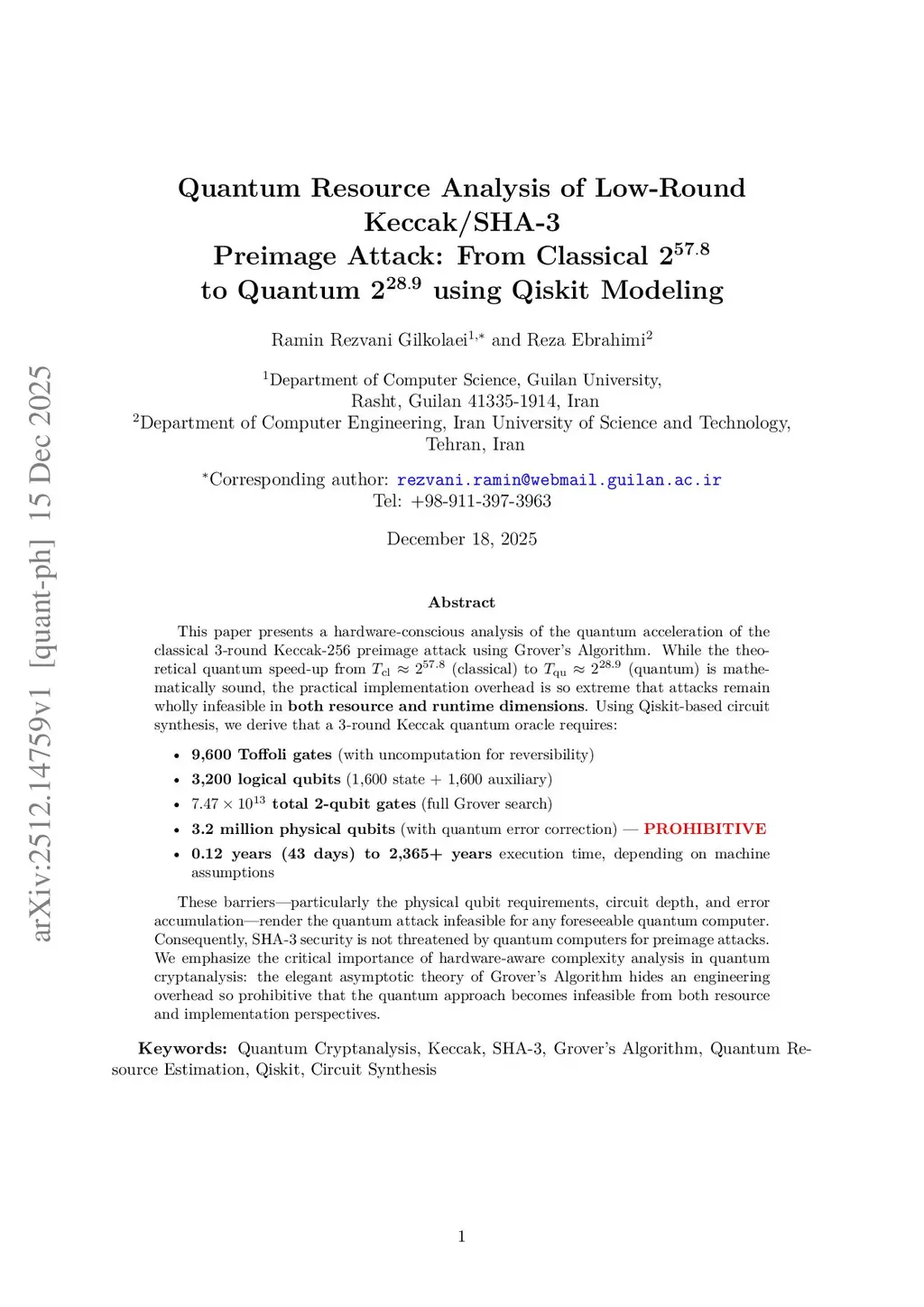 This paper presents a hardware-conscious analysis of the quantum acceleration of the classical 3-round Keccak-256 preimage attack using Grover's Algorithm. While the theoretical quantum speed-up from T_cl=2^{57.8} (classical) to T_qu = 2^{28.9} (quantum) is mathematically sound, the practical implementation overhead is so extreme that attacks remain wholly infeasible in both resource and runtime dimensions. Using Qiskit-based circuit synthesis, we derive that a 3-round Keccak quantum oracle requires: 9,600 Toffoli gates (with uncomputation for reversibility); 3,200 logical qubits (1,600 state + 1,600 auxiliary); 7.47 * 10^{13} total 2-qubit gates (full Grover search); 3.2 million physical qubits (with quantum error correction)PROHIBITIVE; 0.12 years (43 days) to 2,365+ years execution time, depending on machine assumptions. These barriers -- particularly the physical qubit requirements, circuit depth, and error accumulation -- render the quantum attack infeasible for any foreseeable quantum computer. Consequently, SHA-3 security is not threatened by quantum computers for preimage attacks. We emphasize the critical importance of hardware-aware complexity analysis in quantum cryptanalysis: the elegant asymptotic theory of Grover's Algorithm hides an engineering overhead so prohibitive that the quantum approach becomes infeasible from both resource and implementation perspectives.