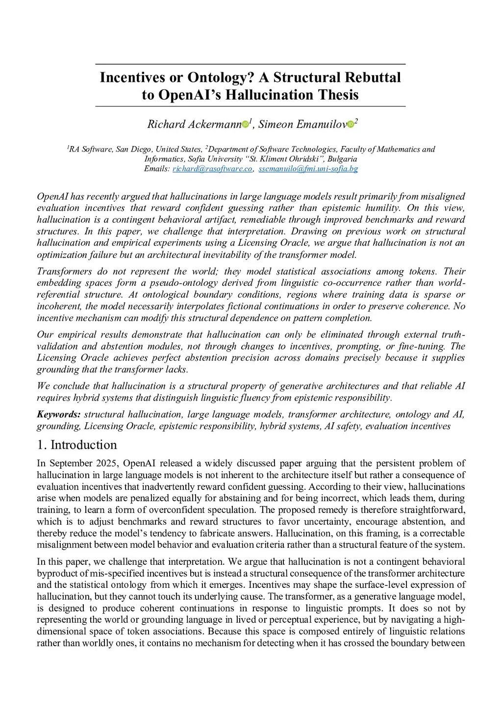 OpenAI has recently argued that hallucinations in large language models result primarily from misaligned evaluation incentives that reward confident guessing rather than epistemic humility. On this view, hallucination is a contingent behavioral artifact, remediable through improved benchmarks and reward structures. In this paper, we challenge that interpretation. Drawing on previous work on structural hallucination and empirical experiments using a Licensing Oracle, we argue that hallucination is not an optimization failure but an architectural inevitability of the transformer model.Transformers do not represent the world; they model statistical associations among tokens. Their embedding spaces form a pseudo-ontology derived from linguistic co-occurrence rather than world-referential structure. At ontological boundary conditions - regions where training data is sparse or incoherent - the model necessarily interpolates fictional continuations in order to preserve coherence. No incentive mechanism can modify this structural dependence on pattern completion.Our empirical results demonstrate that hallucination can only be eliminated through external truth-validation and abstention modules, not through changes to incentives, prompting, or fine-tuning. The Licensing Oracle achieves perfect abstention precision across domains precisely because it supplies grounding that the transformer lacks.We conclude that hallucination is a structural property of generative architectures and that reliable AI requires hybrid systems that distinguish linguistic fluency from epistemic responsibility.