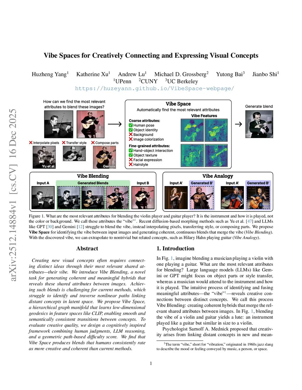 Creating new visual concepts often requires connecting distinct ideas through their most relevant shared attributes -- their vibe. We introduce Vibe Blending, a novel task for generating coherent and meaningful hybrids that reveals these shared attributes between images. Achieving such blends is challenging for current methods, which struggle to identify and traverse nonlinear paths linking distant concepts in latent space. We propose Vibe Space, a hierarchical graph manifold that learns low-dimensional geodesics in feature spaces like CLIP, enabling smooth and semantically consistent transitions between concepts. To evaluate creative quality, we design a cognitively inspired framework combining human judgments, LLM reasoning, and a geometric path-based difficulty score. We find that Vibe Space produces blends that humans consistently rate as more creative and coherent than current methods.