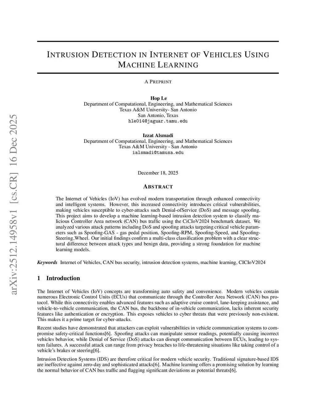 The Internet of Vehicles (IoV) has evolved modern transportation through enhanced connectivity and intelligent systems. However, this increased connectivity introduces critical vulnerabilities, making vehicles susceptible to cyber-attacks such Denial-ofService (DoS) and message spoofing. This project aims to develop a machine learning-based intrusion detection system to classify malicious Controller Area network (CAN) bus traffic using the CiCIoV2024 benchmark dataset. We analyzed various attack patterns including DoS and spoofing attacks targeting critical vehicle parameters such as Spoofing-GAS - gas pedal position, Spoofing-RPM, Spoofing-Speed, and Spoofing-Steering\_Wheel. Our initial findings confirm a multi-class classification problem with a clear structural difference between attack types and benign data, providing a strong foundation for machine learning models.