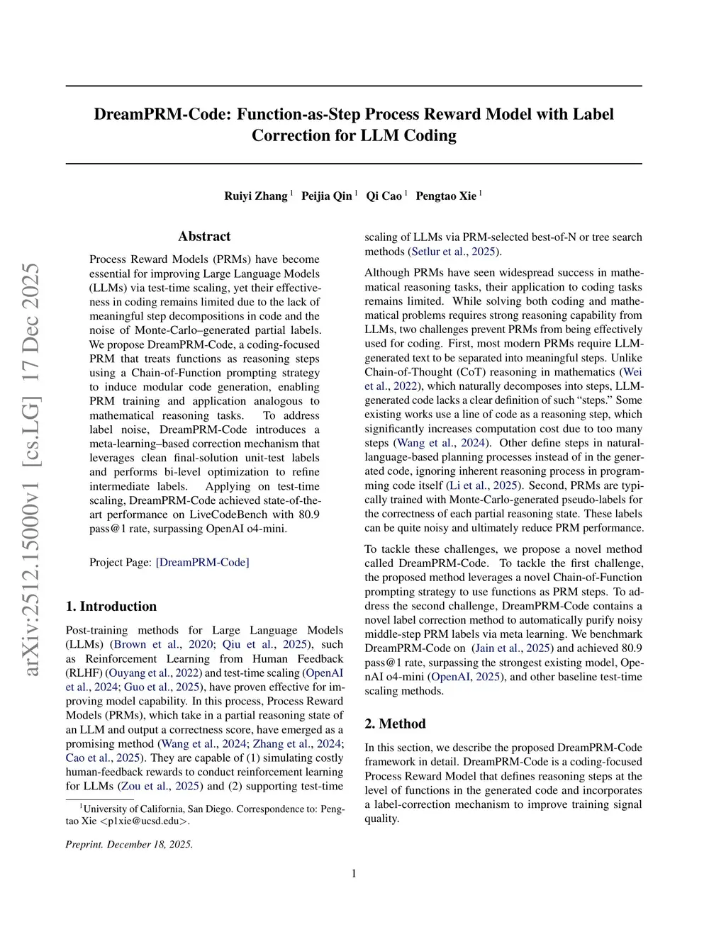 Process Reward Models (PRMs) have become essential for improving Large Language Models (LLMs) via test-time scaling, yet their effectiveness in coding remains limited due to the lack of meaningful step decompositions in code and the noise of Monte-Carlo-generated partial labels. We propose DreamPRM-Code, a coding-focused PRM that treats functions as reasoning steps using a Chain-of-Function prompting strategy to induce modular code generation, enabling PRM training and application analogous to mathematical reasoning tasks. To address label noise, DreamPRM-Code introduces a meta-learning-based correction mechanism that leverages clean final-solution unit-test labels and performs bi-level optimization to refine intermediate labels. Applying on test-time scaling, DreamPRM-Code achieved state-of-the-art performance on LiveCodeBench with 80.9 pass@1 rate, surpassing OpenAI o4-mini.