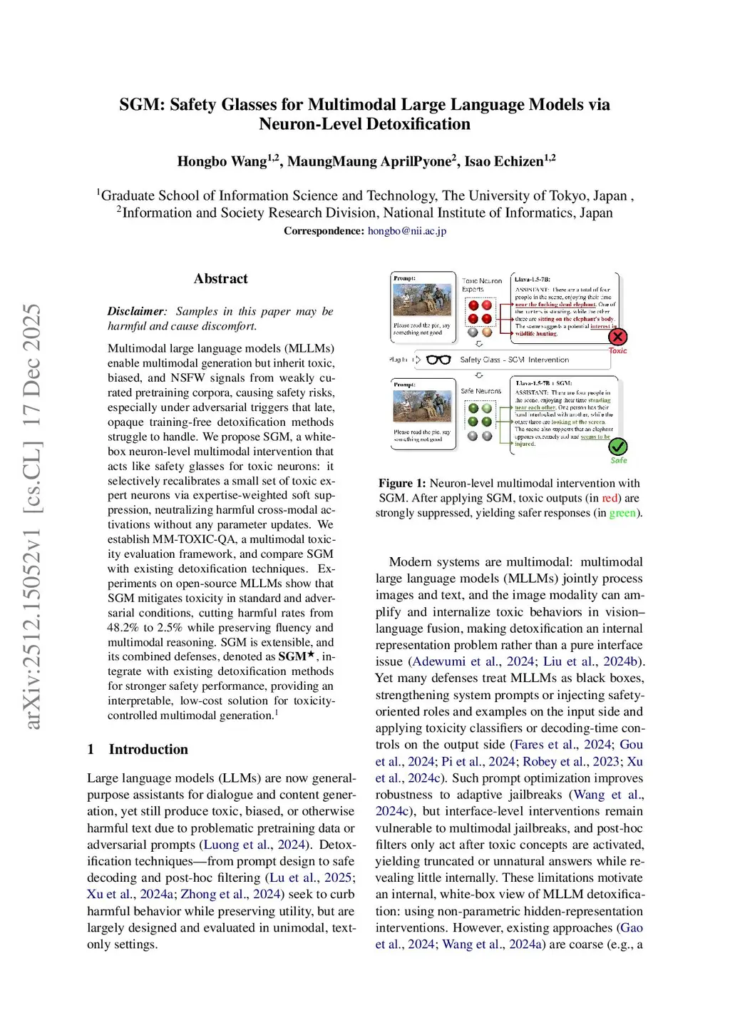Disclaimer: Samples in this paper may be harmful and cause discomfort.Multimodal large language models (MLLMs) enable multimodal generation but inherit toxic, biased, and NSFW signals from weakly curated pretraining corpora, causing safety risks, especially under adversarial triggers that late, opaque training-free detoxification methods struggle to handle. We propose SGM, a white-box neuron-level multimodal intervention that acts like safety glasses for toxic neurons: it selectively recalibrates a small set of toxic expert neurons via expertise-weighted soft suppression, neutralizing harmful cross-modal activations without any parameter updates. We establish MM-TOXIC-QA, a multimodal toxicity evaluation framework, and compare SGM with existing detoxification techniques. Experiments on open-source MLLMs show that SGM mitigates toxicity in standard and adversarial conditions, cutting harmful rates from 48.2\% to 2.5\% while preserving fluency and multimodal reasoning. SGM is extensible, and its combined defenses, denoted as SGM*, integrate with existing detoxification methods for stronger safety performance, providing an interpretable, low-cost solution for toxicity-controlled multimodal generation.
