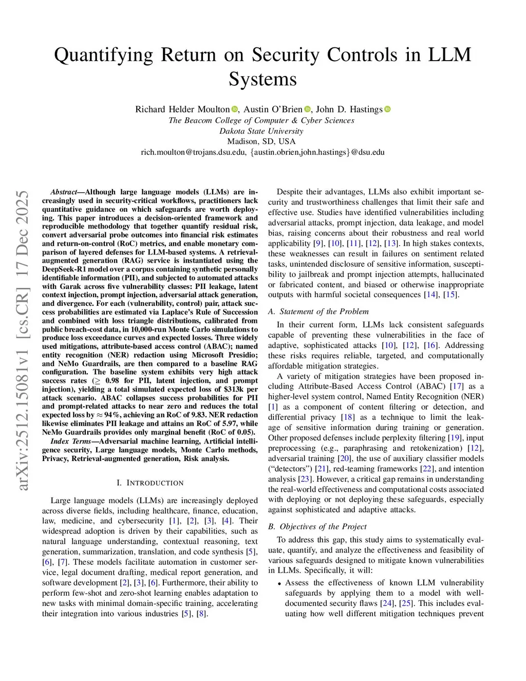 Although large language models (LLMs) are increasingly used in security-critical workflows, practitioners lack quantitative guidance on which safeguards are worth deploying. This paper introduces a decision-oriented framework and reproducible methodology that together quantify residual risk, convert adversarial probe outcomes into financial risk estimates and return-on-control (RoC) metrics, and enable monetary comparison of layered defenses for LLM-based systems. A retrieval-augmented generation (RAG) service is instantiated using the DeepSeek-R1 model over a corpus containing synthetic personally identifiable information (PII), and subjected to automated attacks with Garak across five vulnerability classes: PII leakage, latent context injection, prompt injection, adversarial attack generation, and divergence. For each (vulnerability, control) pair, attack success probabilities are estimated via Laplace's Rule of Succession and combined with loss triangle distributions, calibrated from public breach-cost data, in 10,000-run Monte Carlo simulations to produce loss exceedance curves and expected losses. Three widely used mitigations, attribute-based access control (ABAC); named entity recognition (NER) redaction using Microsoft Presidio; and NeMo Guardrails, are then compared to a baseline RAG configuration. The baseline system exhibits very high attack success rates (>= 0.98 for PII, latent injection, and prompt injection), yielding a total simulated expected loss of $313k per attack scenario. ABAC collapses success probabilities for PII and prompt-related attacks to near zero and reduces the total expected loss by ~94%, achieving an RoC of 9.83. NER redaction likewise eliminates PII leakage and attains an RoC of 5.97, while NeMo Guardrails provides only marginal benefit (RoC of 0.05).