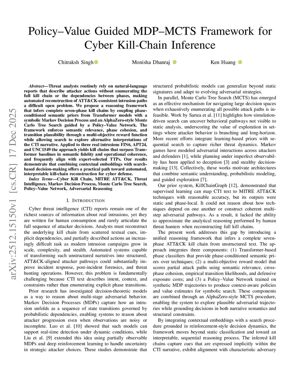 Threat analysts routinely rely on natural-language reports that describe attacker actions without enumerating the full kill chain or the dependencies between phases, making automated reconstruction of ATT&CK consistent intrusion paths a difficult open problem. We propose a reasoning framework that infers complete seven-phase kill chains by coupling phase-conditioned semantic priors from Transformer models with a symbolic Markov Decision Process and an AlphaZero-style Monte Carlo Tree Search guided by a Policy-Value Network. The framework enforces semantic relevance, phase cohesion, and transition plausibility through a multi-objective reward function while allowing search to explore alternative interpretations of the CTI narrative. Applied to three real intrusions FIN6, APT24, and UNC1549 the approach yields kill chains that surpass Transformer baselines in semantic fidelity and operational coherence, and frequently align with expert-selected TTPs. Our results demonstrate that combining contextual embeddings with search-based decision-making offers a practical path toward automated, interpretable kill-chain reconstruction for cyber defense.