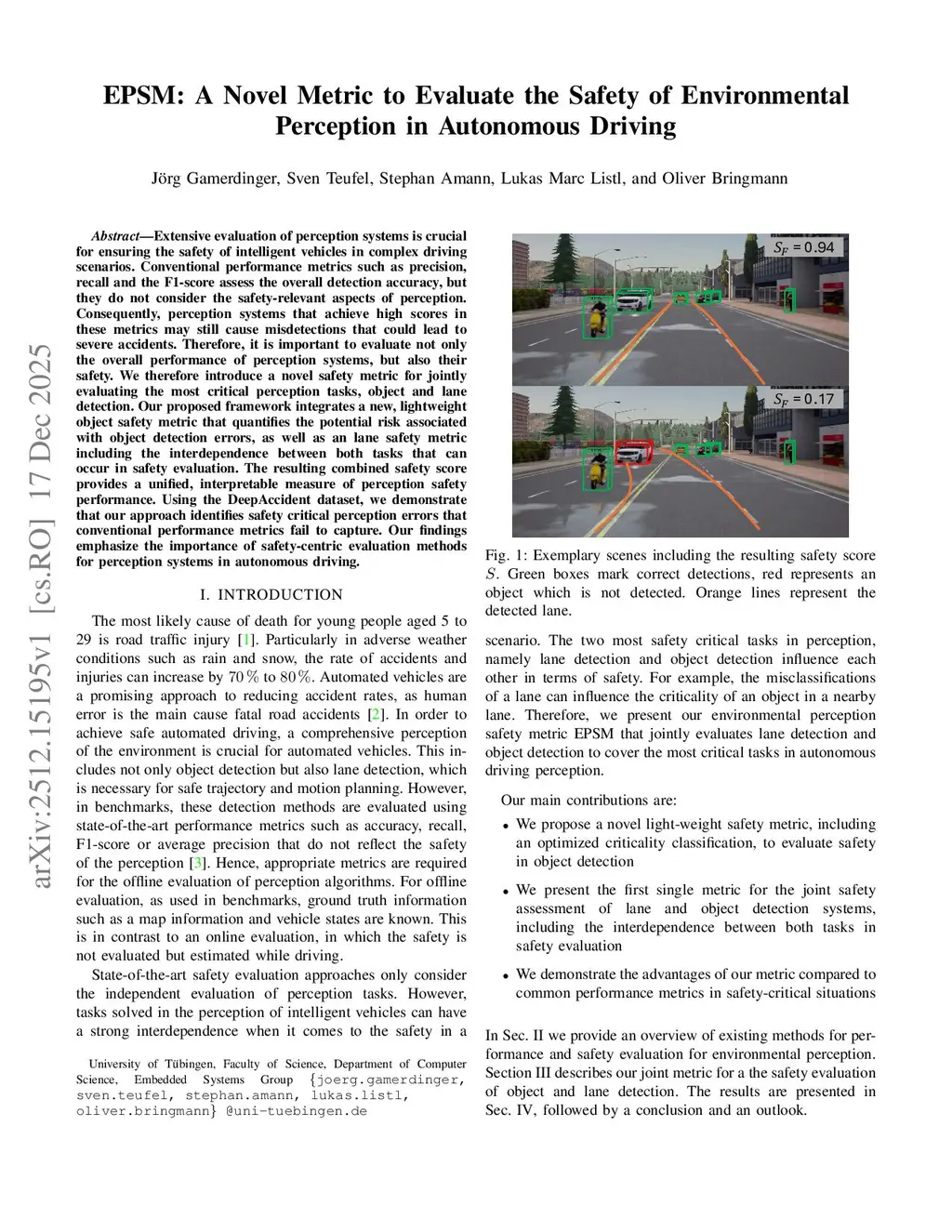 Extensive evaluation of perception systems is crucial for ensuring the safety of intelligent vehicles in complex driving scenarios. Conventional performance metrics such as precision, recall and the F1-score assess the overall detection accuracy, but they do not consider the safety-relevant aspects of perception. Consequently, perception systems that achieve high scores in these metrics may still cause misdetections that could lead to severe accidents. Therefore, it is important to evaluate not only the overall performance of perception systems, but also their safety. We therefore introduce a novel safety metric for jointly evaluating the most critical perception tasks, object and lane detection. Our proposed framework integrates a new, lightweight object safety metric that quantifies the potential risk associated with object detection errors, as well as an lane safety metric including the interdependence between both tasks that can occur in safety evaluation. The resulting combined safety score provides a unified, interpretable measure of perception safety performance. Using the DeepAccident dataset, we demonstrate that our approach identifies safety critical perception errors that conventional performance metrics fail to capture. Our findings emphasize the importance of safety-centric evaluation methods for perception systems in autonomous driving.