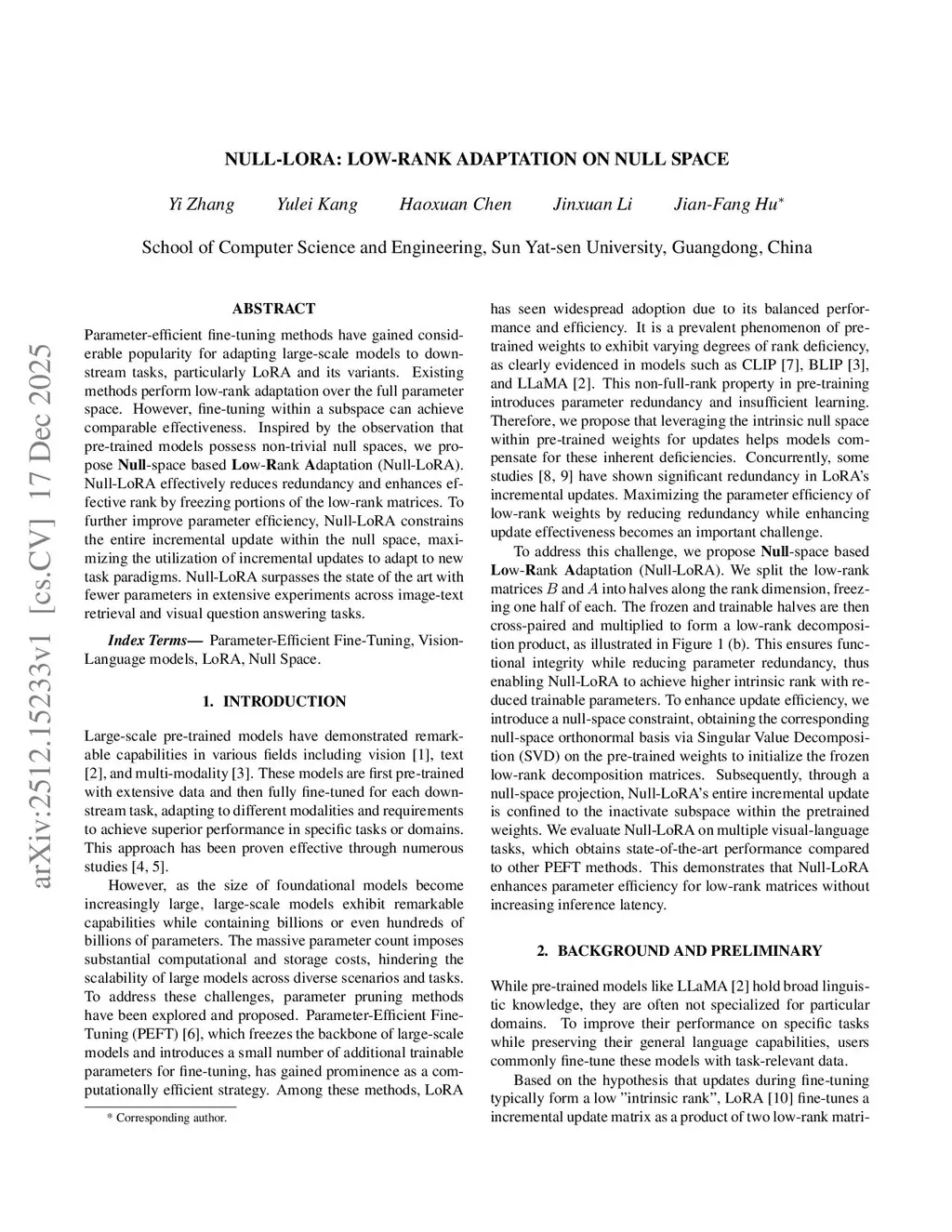 Parameter-efficient fine-tuning methods have gained considerable popularity for adapting large-scale models to downstream tasks, particularly LoRA and its variants. Existing methods perform low-rank adaptation over the full parameter space. However, fine-tuning within a subspace can achieve comparable effectiveness. Inspired by the observation that pre-trained models possess non-trivial null spaces, we propose Null-space based Low-Rank Adaptation (Null-LoRA). Null-LoRA effectively reduces redundancy and enhances effective rank by freezing portions of the low-rank matrices. To further improve parameter efficiency, Null-LoRA constrains the entire incremental update within the null space, maximizing the utilization of incremental updates to adapt to new task paradigms. Null-LoRA surpasses the state of the art with fewer parameters in extensive experiments across image-text retrieval and visual question answering tasks.