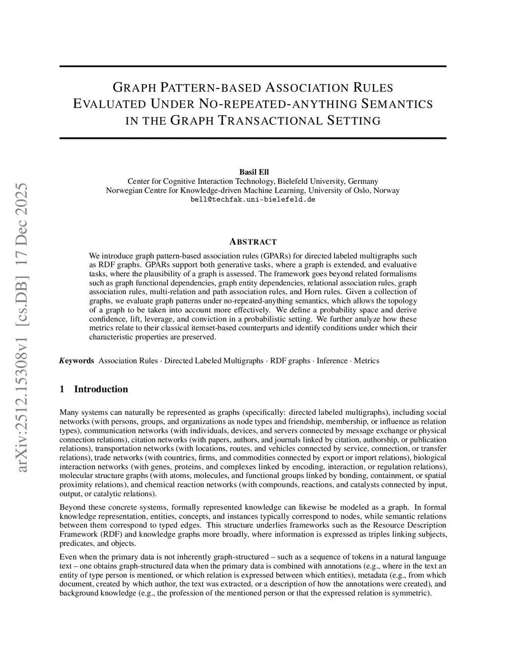 We introduce graph pattern-based association rules (GPARs) for directed labeled multigraphs such as RDF graphs. GPARs support both generative tasks, where a graph is extended, and evaluative tasks, where the plausibility of a graph is assessed. The framework goes beyond related formalisms such as graph functional dependencies, graph entity dependencies, relational association rules, graph association rules, multi-relation and path association rules, and Horn rules. Given a collection of graphs, we evaluate graph patterns under no-repeated-anything semantics, which allows the topology of a graph to be taken into account more effectively. We define a probability space and derive confidence, lift, leverage, and conviction in a probabilistic setting. We further analyze how these metrics relate to their classical itemset-based counterparts and identify conditions under which their characteristic properties are preserved.