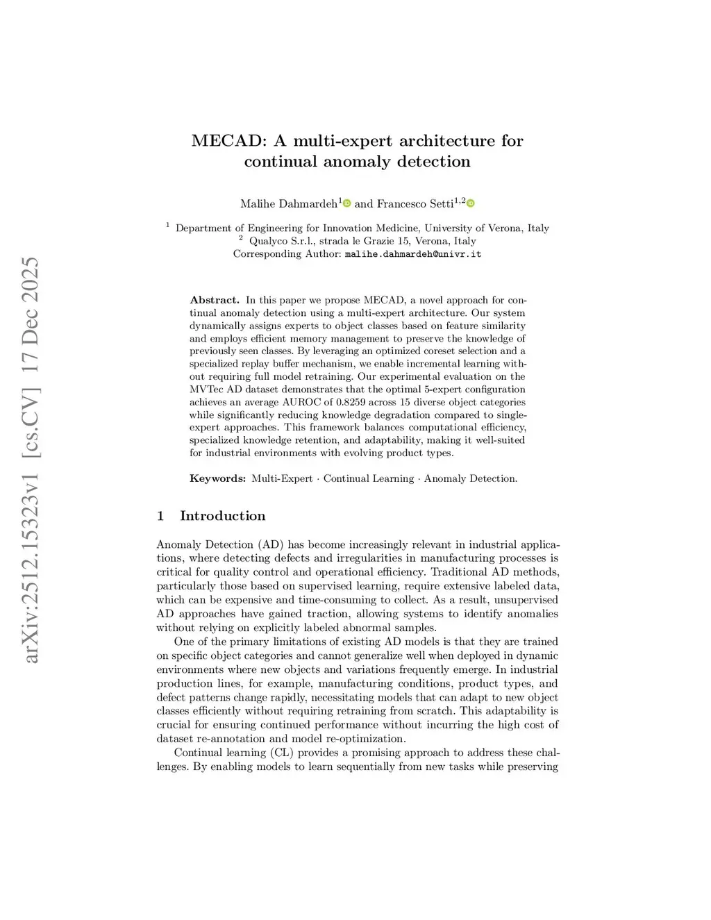 In this paper we propose MECAD, a novel approach for continual anomaly detection using a multi-expert architecture. Our system dynamically assigns experts to object classes based on feature similarity and employs efficient memory management to preserve the knowledge of previously seen classes. By leveraging an optimized coreset selection and a specialized replay buffer mechanism, we enable incremental learning without requiring full model retraining. Our experimental evaluation on the MVTec AD dataset demonstrates that the optimal 5-expert configuration achieves an average AUROC of 0.8259 across 15 diverse object categories while significantly reducing knowledge degradation compared to single-expert approaches. This framework balances computational efficiency, specialized knowledge retention, and adaptability, making it well-suited for industrial environments with evolving product types.