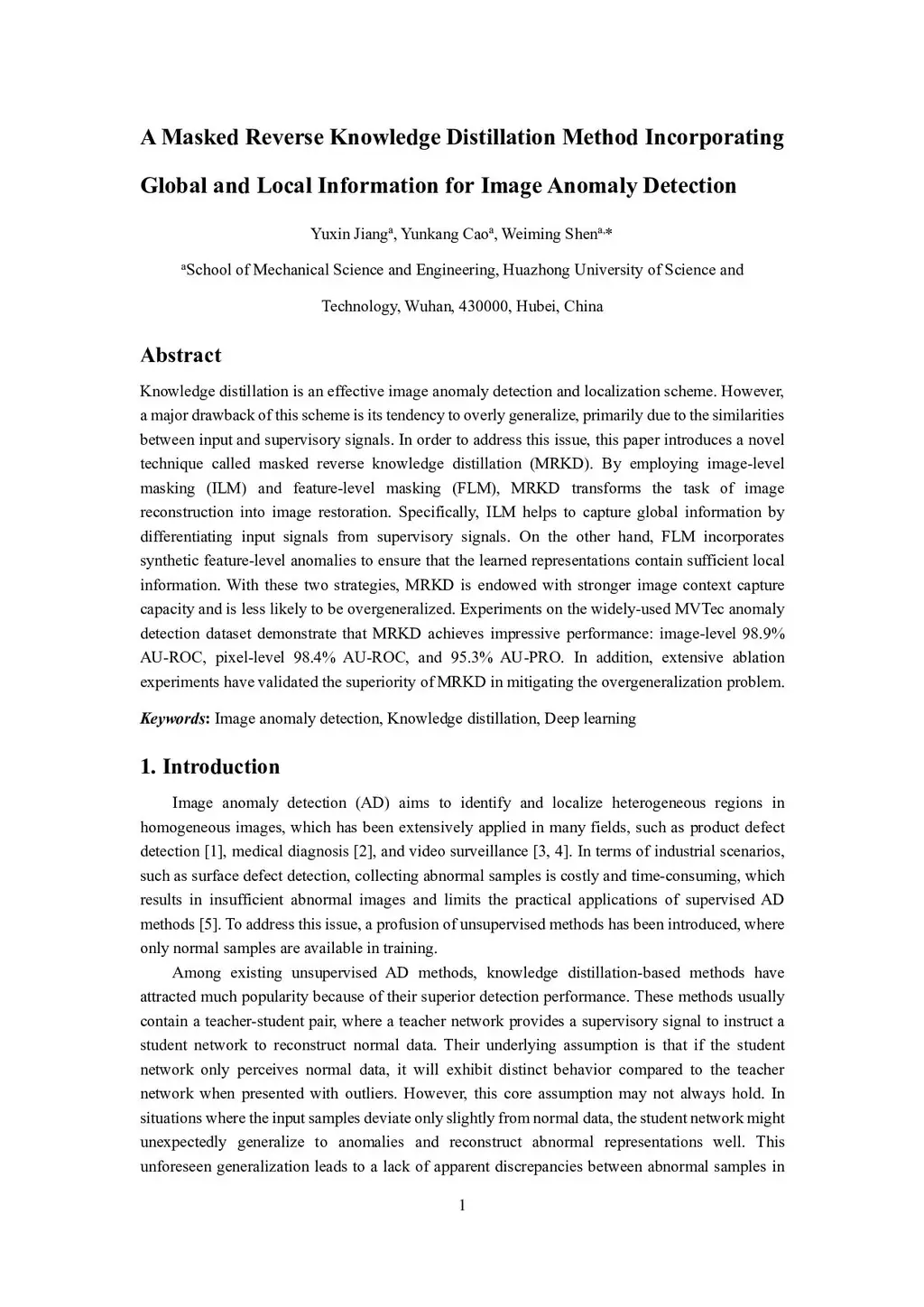 A Masked Reverse Knowledge Distillation Method Incorporating Global and Local Information for Image Anomaly Detection