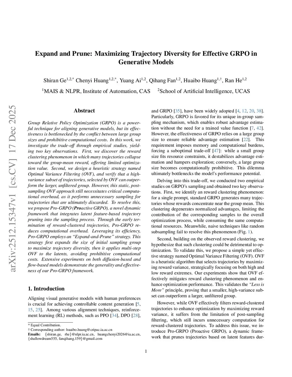 Group Relative Policy Optimization (GRPO) is a powerful technique for aligning generative models, but its effectiveness is bottlenecked by the conflict between large group sizes and prohibitive computational costs. In this work, we investigate the trade-off through empirical studies, yielding two key observations. First, we discover the reward clustering phenomenon in which many trajectories collapse toward the group-mean reward, offering limited optimization value. Second, we design a heuristic strategy named Optimal Variance Filtering (OVF), and verify that a high-variance subset of trajectories, selected by OVF can outperform the larger, unfiltered group. However, this static, post-sampling OVF approach still necessitates critical computational overhead, as it performs unnecessary sampling for trajectories that are ultimately discarded. To resolve this, we propose Pro-GRPO (Proactive GRPO), a novel dynamic framework that integrates latent feature-based trajectory pruning into the sampling process. Through the early termination of reward-clustered trajectories, Pro-GRPO reduces computational overhead. Leveraging its efficiency, Pro-GRPO employs an "Expand-and-Prune" strategy. This strategy first expands the size of initial sampling group to maximize trajectory diversity, then it applies multi-step OVF to the latents, avoiding prohibitive computational costs. Extensive experiments on both diffusion-based and flow-based models demonstrate the generality and effectiveness of our Pro-GRPO framework.